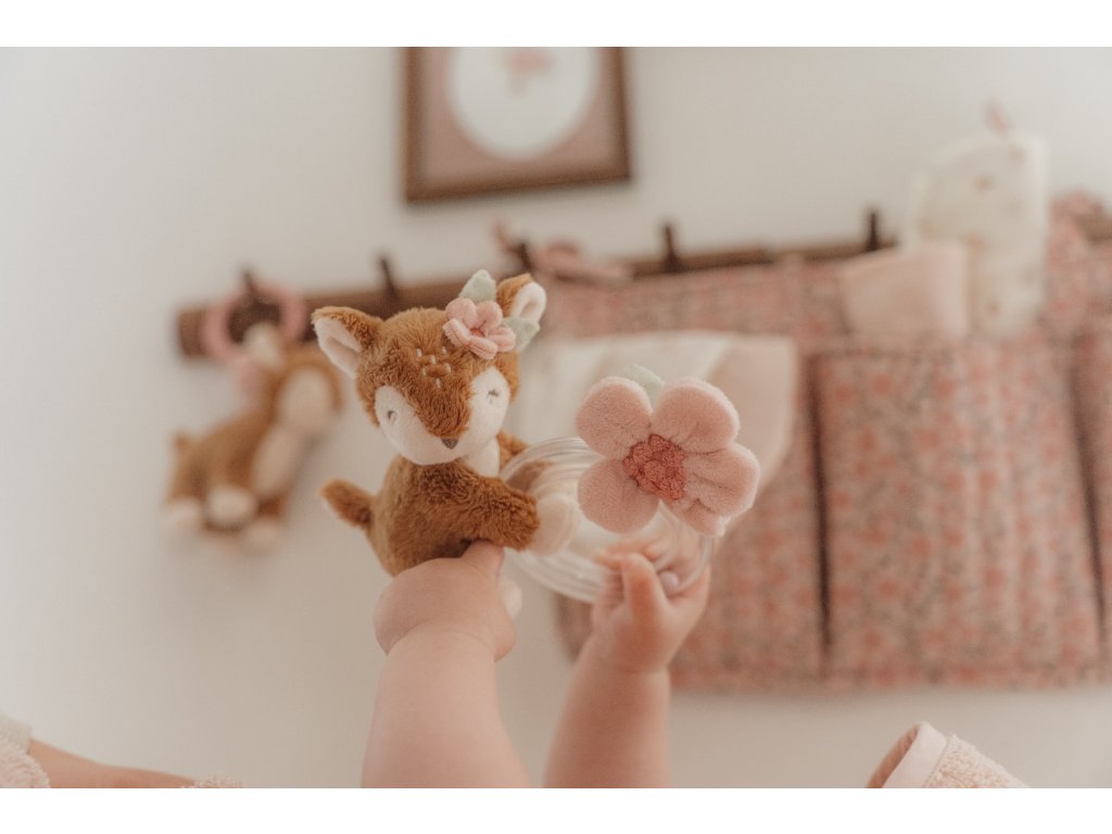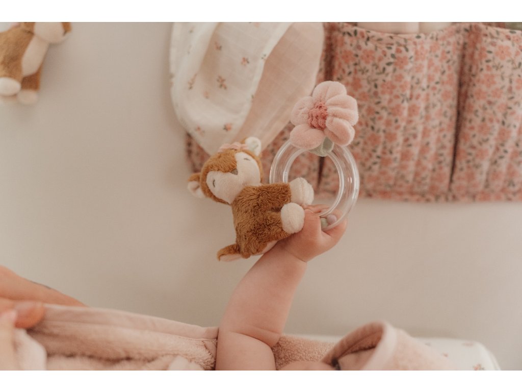 Originálna hrkálka v podobe priehľadného krúžku s hrkajúcimi korálkami a plyšovou srnkou a kvietkom je ideálna ako prvá hračka pre vaše bábätko. Hrkálka má tvar pre ľahké uchopenie a rôznorodé textúry na skúmanie rukami aj ústami.