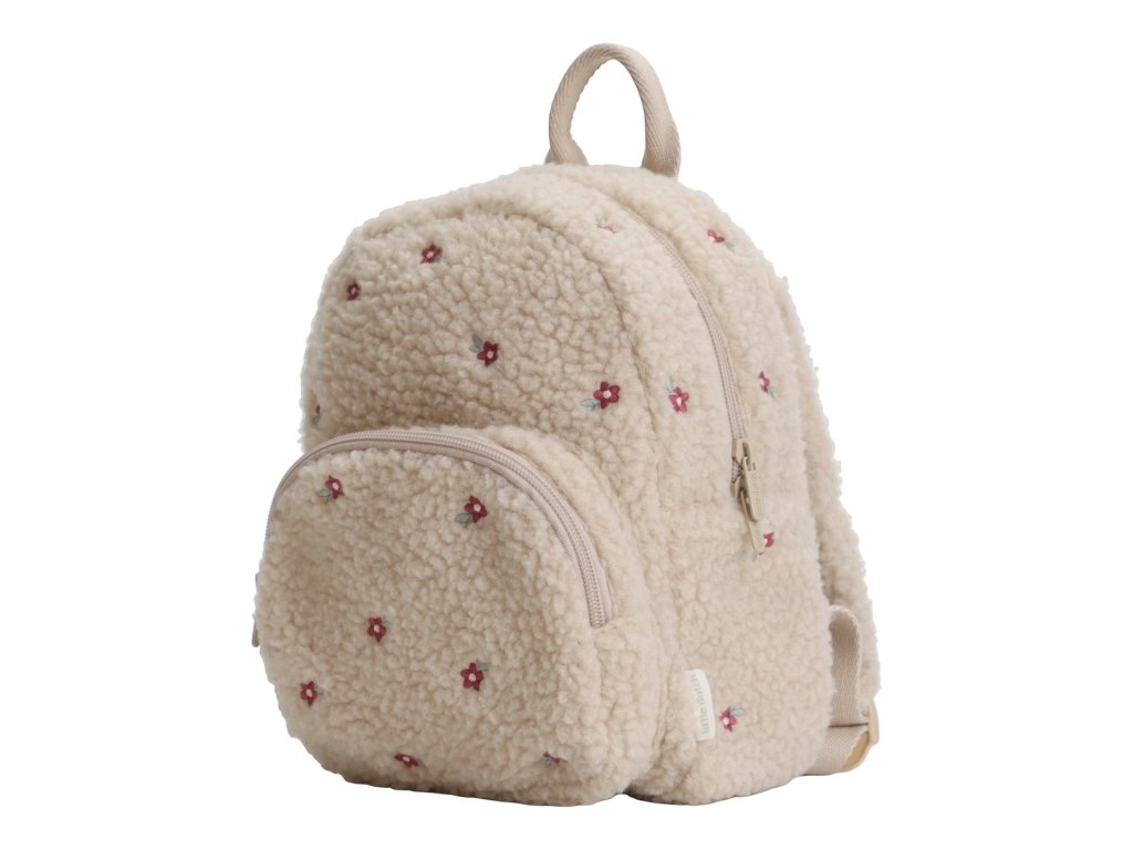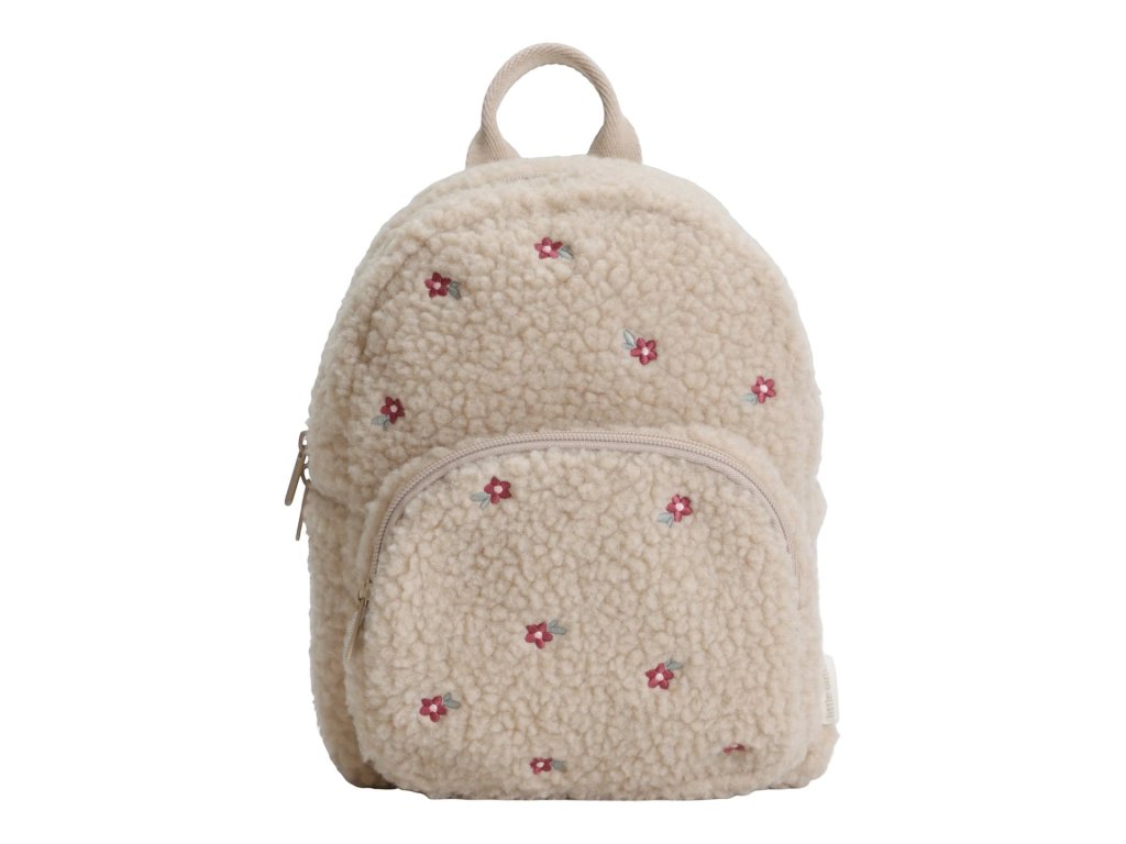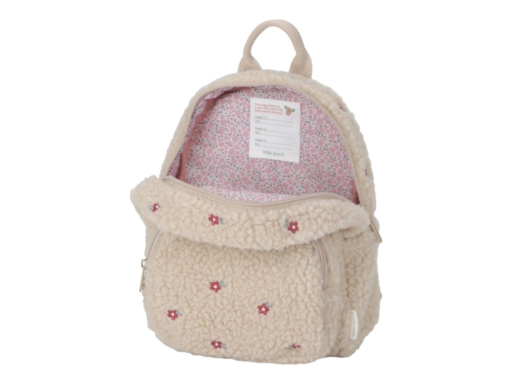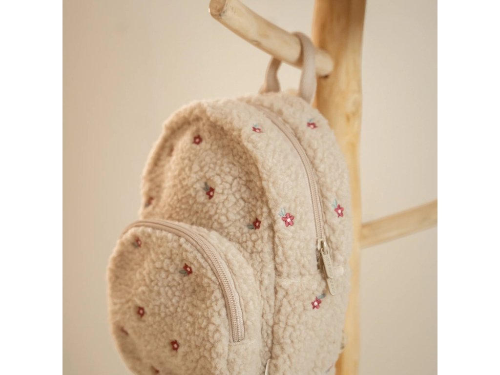 Rozkošný detský batoh z mäkkého plyšového materiálu s kvetinovou výšivkou je ideálnym doplnkom na výlety do prírody i prechádzky mestom. Batoh má nastaviteľné ramenné popruhy a hrudný pás na príjemné nosenie. Držadlo umožňuje prenášanie v ruke. Batoh je vybavený vonkajším vreckom na zips na uloženie drobností a vnútorný priestor s vreckom, elastickým držiakom na pitie a menovkou.