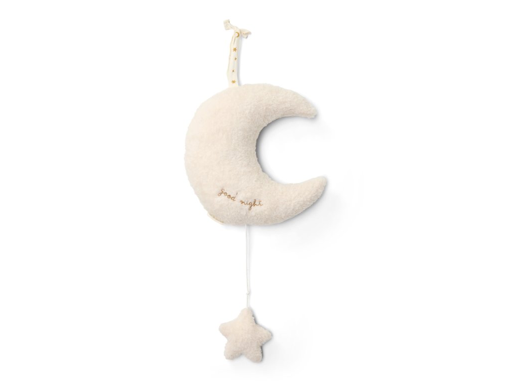 Závěsný plyšový měsíček v sobě skrývá natahovací hudební box s příjemnou ukolébavkou, která vaše miminko uklidní a pomůže mu usnout. Měsíček snadno zavěsíte poblíž postýlky.