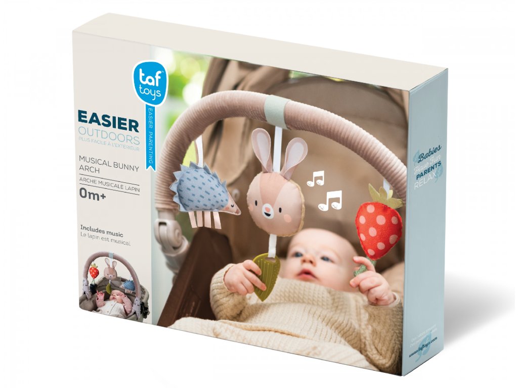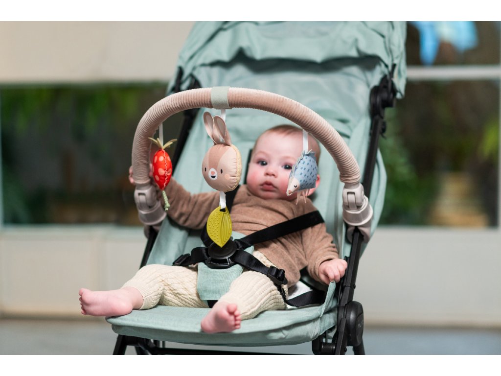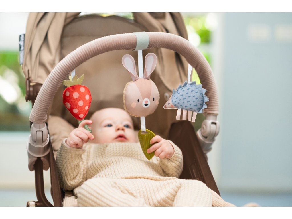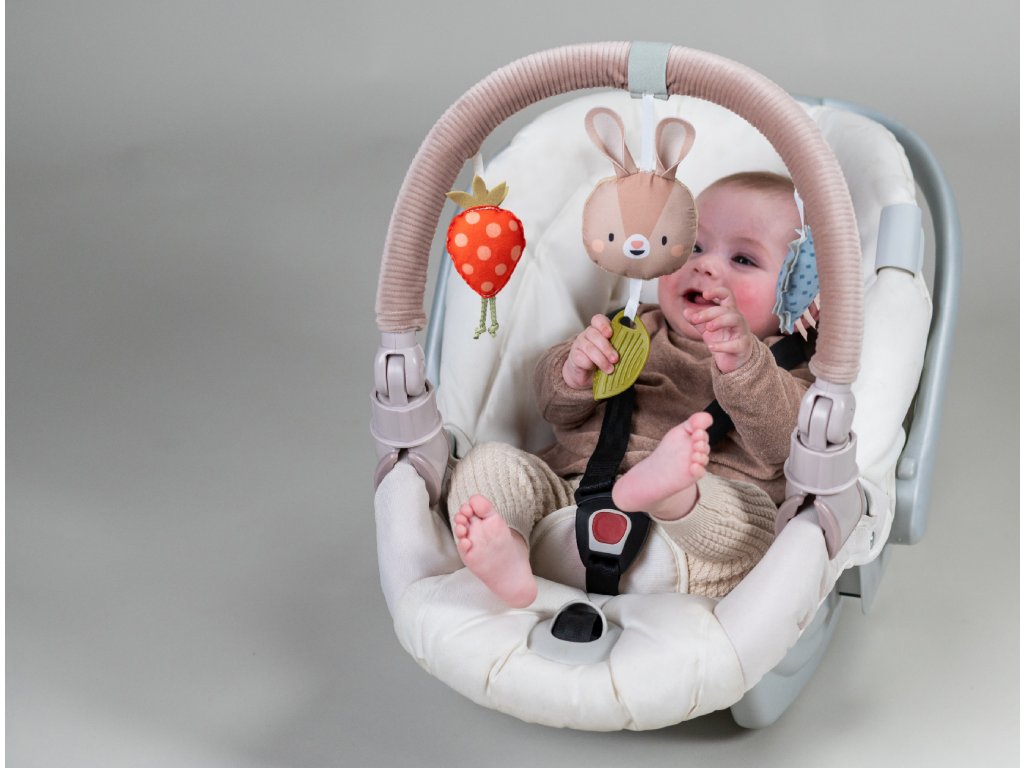 Hudobná hrazda určená na pripevnenie na kočík alebo autosedačku zabaví vaše bábätko na cestách. Ľahko ju s pomocou flexibilných plastových klipsov pripevníte k väčšine kočíkov aj autosedačiek. Pozornosť dieťaťa upúta králiček, ktorý po ľahkom dotyku hrá melódiu, hrkajúci ježko aj cinkajúca jahôdka.