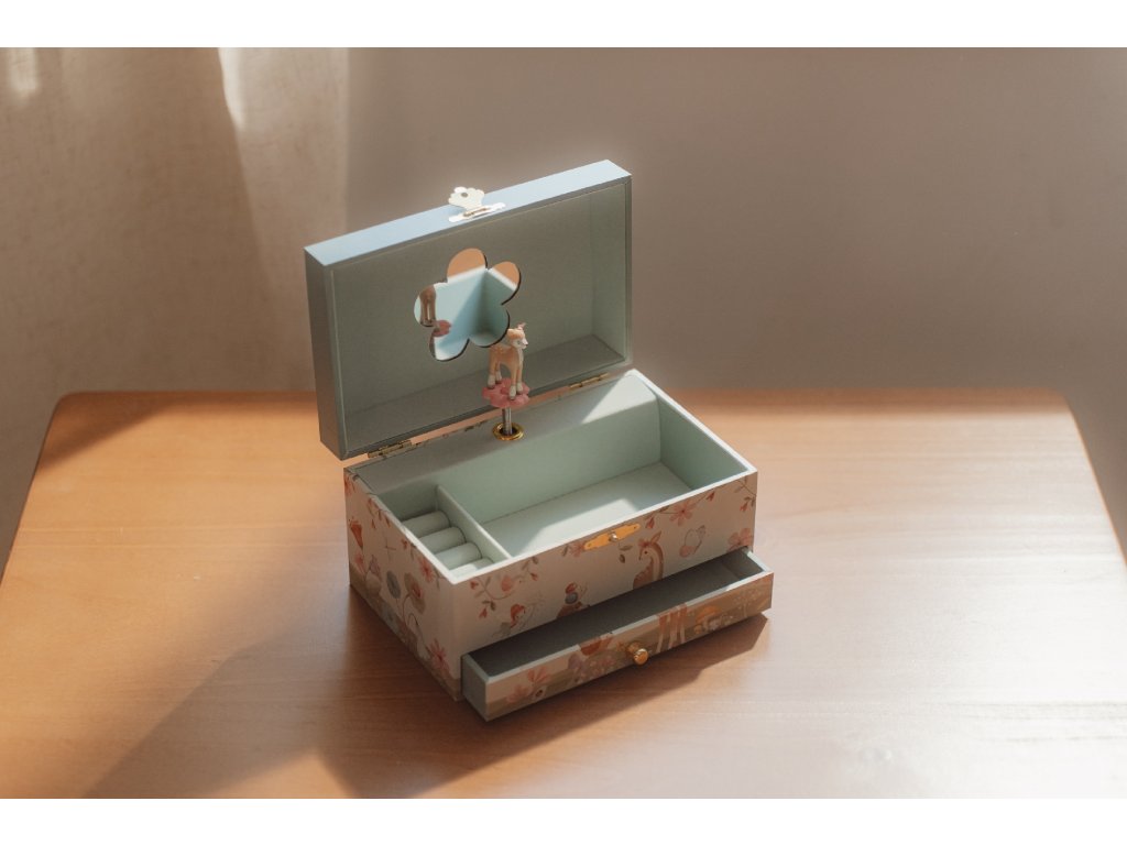 Krásna šperkovnica so zrkadielkom a hudobným boxom, ktorý po natiahnutí hrá nežnú melódiu. Vaša malá parádnica si do šperkovnice s potlačou motívov zo života v lese môže ukladať svoje šperky a iné vzácne drobnosti.