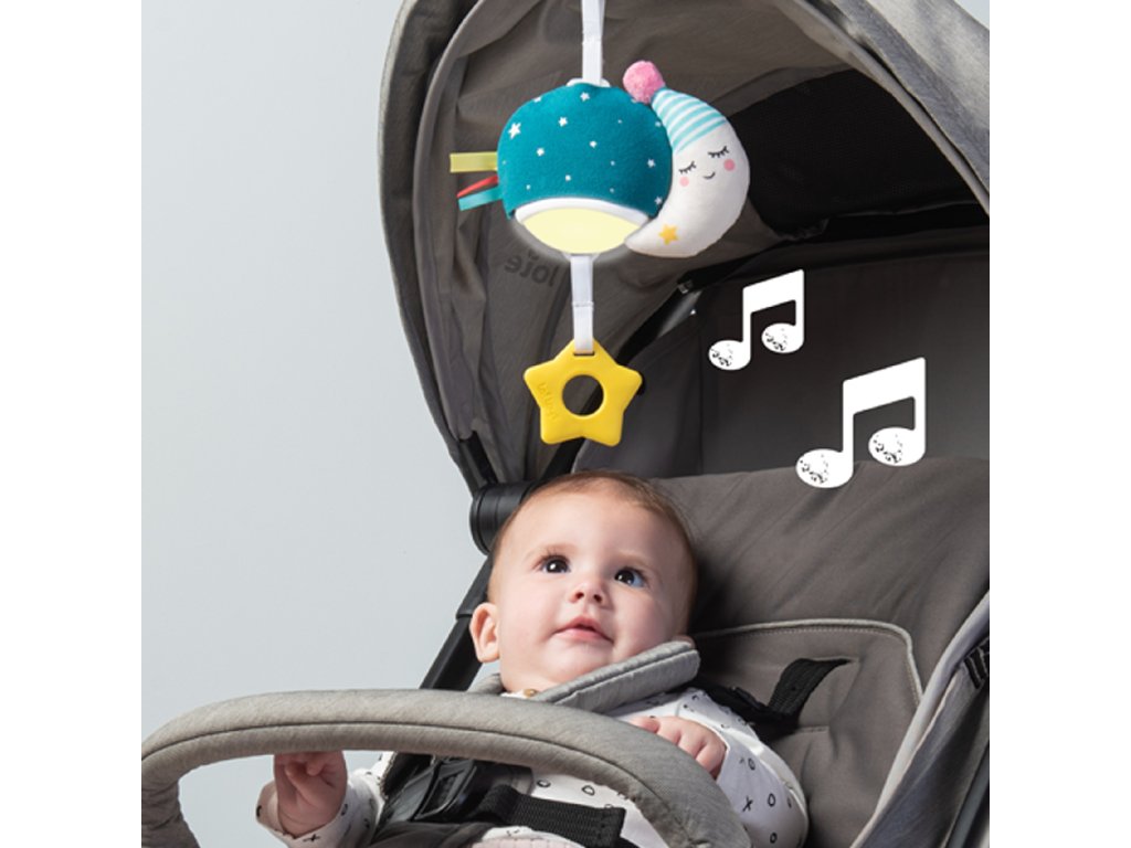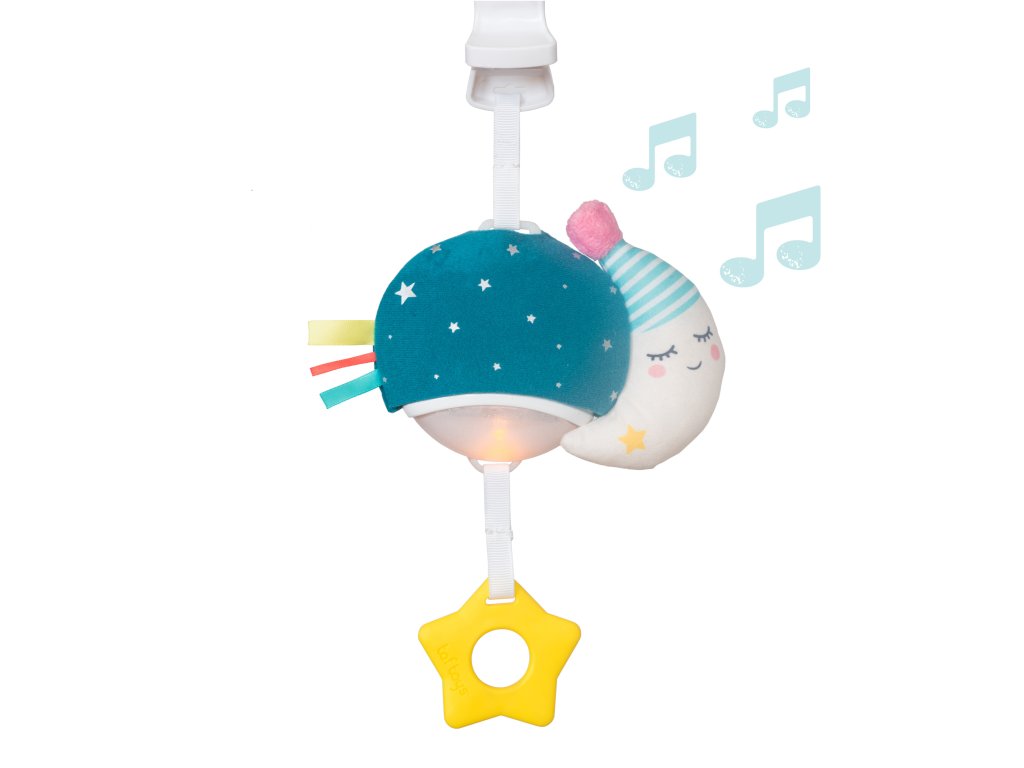 Závesný hudobný box so svetielkom zabaví vaše bábätko doma i na cestách. Hudbu si svetielkom dieťa samo aktivuje zatiahnutím za hryzátko. Hračka hrá tri veselé melódie a upokojujúce zvuky v celkovej dĺžke 20 minút, jemné svetielko počas hrania mení farby.