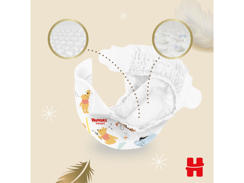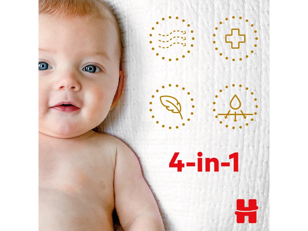 Inovované prémiové jednorazové plienky HUGGIES® EXTRA CARE sú najjemnejšie a najmäkšie plienky pod značkou HUGGIES®. Dve špeciálne absorpčné zóny pre ešte lepšiu ochranu pokožky - mäkké vankúšiky vpredu a vrecko na tekutú stolicu vzadu. Poskytuje starostlivosť o pokožku 4v1 - mäkká, savá, priedušná a hypoalergénna. Indikátor vlhkosti zmení farbu, keď je čas plienku vymeniť. Mäkký elastický pás pomáha predchádzať zapareninám na citlivej detskej pokožke.