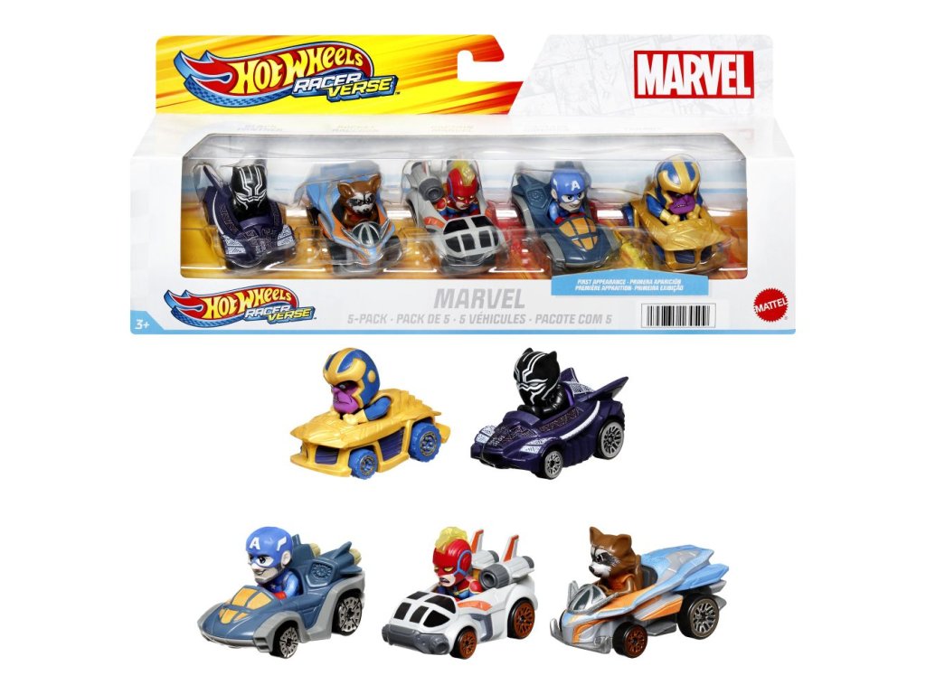 Súprava 5 ks autíčok Hot Wheels® Racerverse je určená pre fanúšikov filmov Marvel, ktorí milujú Hot Wheels®. Autíčka Racerverse sú v mierke 1:64 a sú navrhnuté pre úžasný výkon na závodnej dráhe! Za volantom týchto štylizovaných áut vždy sedí obľúbená postavička z legendárnych filmov Marvel. Farby a vzhľad výrobku sa môžu líšiť.