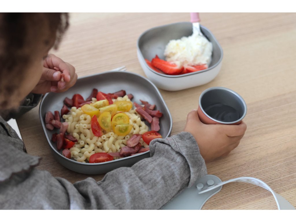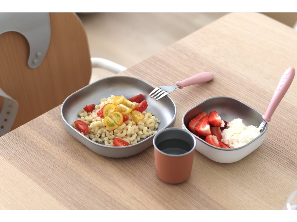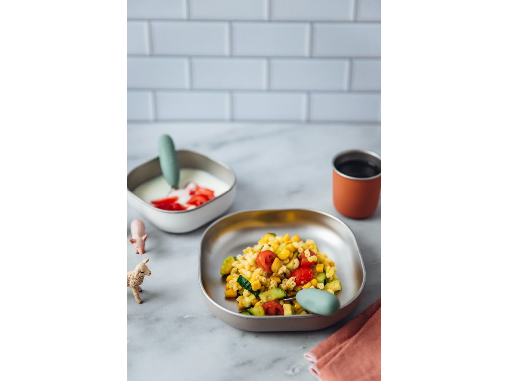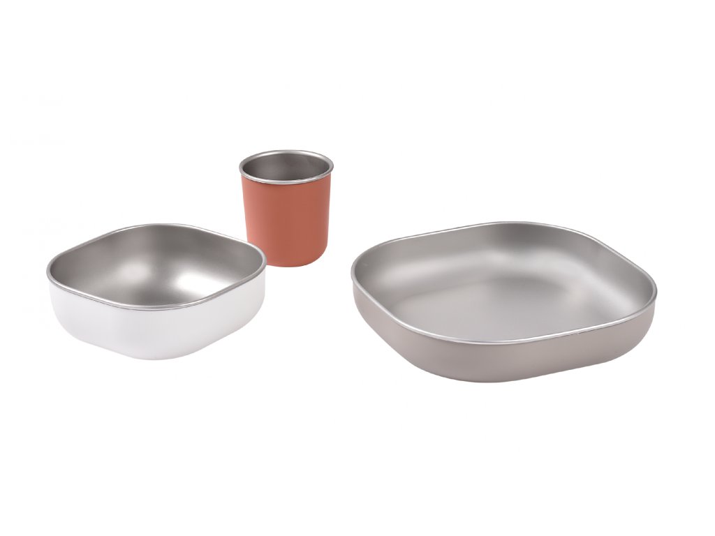 Jedálenskú sadu inovatívneho nerezového riadu so silikónovou povrchovou vrstvou tvorí tanier, miska a téglik. Ergonomický tvar s vysokými stranami a zaoblenými rohmi je ideálny na učenie detí samostatnému stolovaniu. Silikónový povrch riadu pomáha, aby riad nekĺzal na stole ani v ruke.