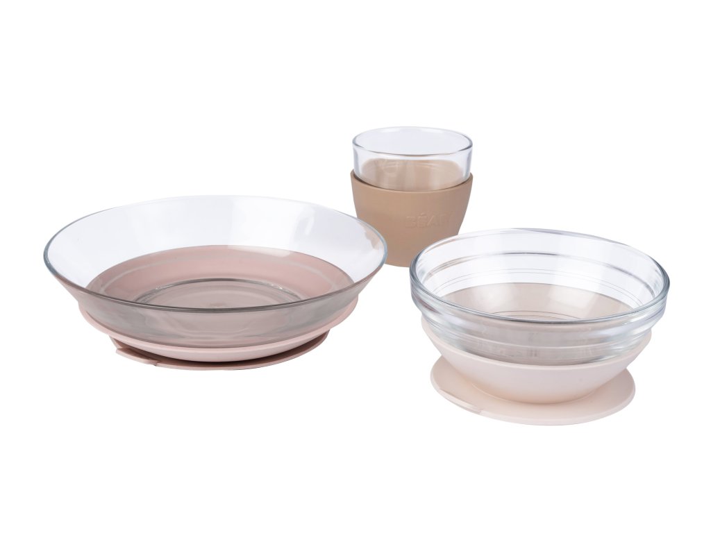 Unikátnu sadu riadu z tvrdeného skla tvorí jedálenská miska, tanierik a pohár ergonomického, zaobleného tvaru s hladkými hranami. Miska a tanier sú doplnené špeciálnymi odnímateľnými podložkami z pružného materiálu s prísavkou, ktorá zaisťuje stabilitu misky či taniera na stole a uľahčuje dieťaťu stolovanie. Návlek na pohárik z rovnakého materiálu uľahčuje dieťaťu uchopenie pohára a znižuje riziko jeho vykĺznutia z ruky.