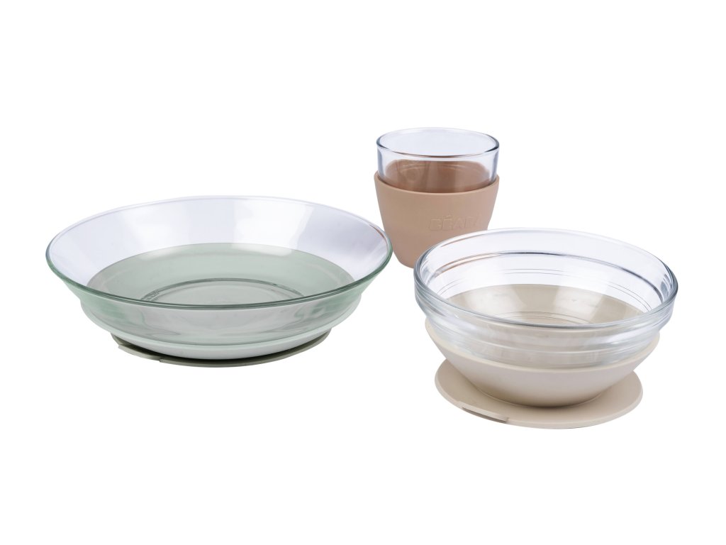 Unikátnu sadu riadu z tvrdeného skla tvorí jedálenská miska, tanierik a pohár ergonomického, zaobleného tvaru s hladkými hranami. Miska a tanier sú doplnené špeciálnymi odnímateľnými podložkami z pružného materiálu s prísavkou, ktorá zaisťuje stabilitu misky či taniera na stole a uľahčuje dieťaťu stolovanie. Návlek na pohárik z rovnakého materiálu uľahčuje dieťaťu uchopenie pohára a znižuje riziko jeho vykĺznutia z ruky.