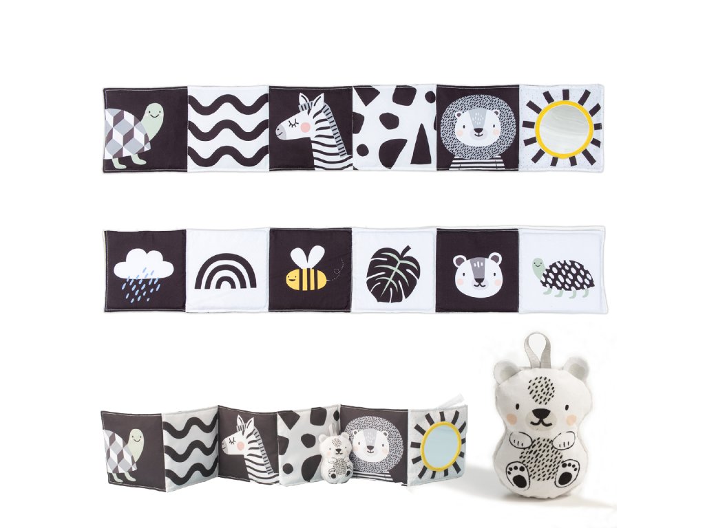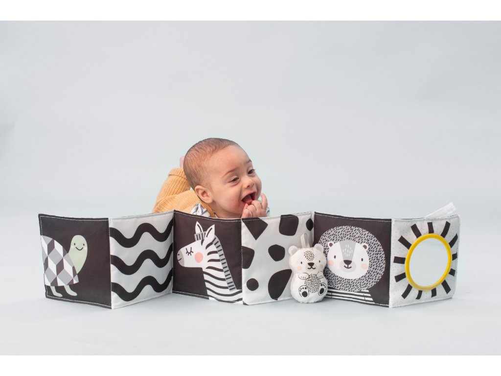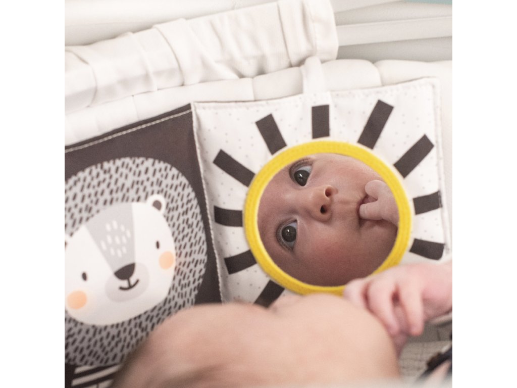 Kniha ponúka dve strany s bezpečným zrkadlom a vysoko kontrastnými obrázkami v základných farbách, ktoré podnecujú rozvoj zmyslov a emočnej inteligencie dieťaťa. Pri skúmaní rukami stránky šuštia, šuštiacou je aj odnímateľný roztomilý medvedík.