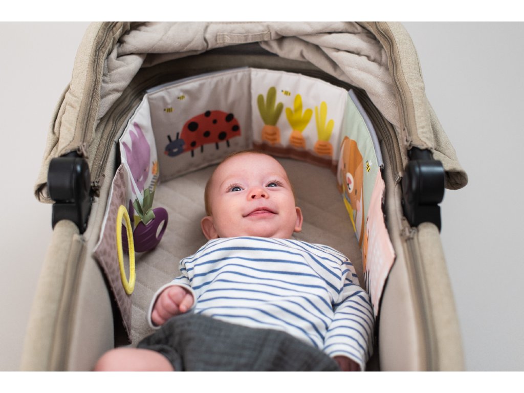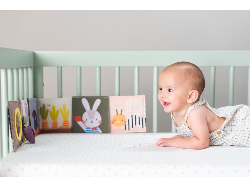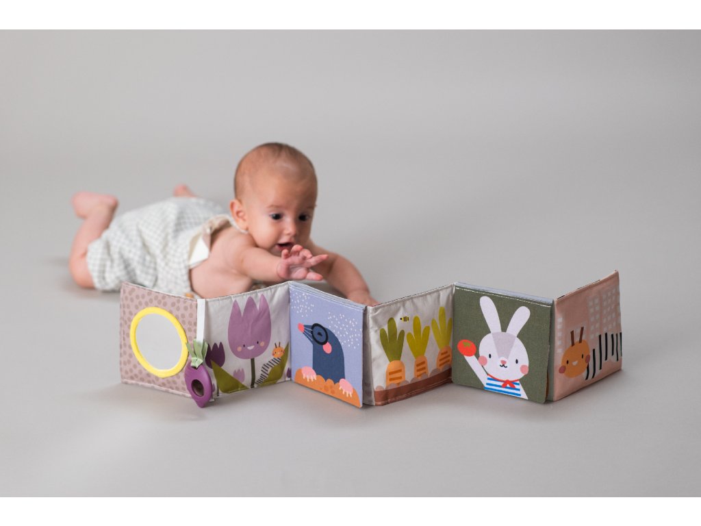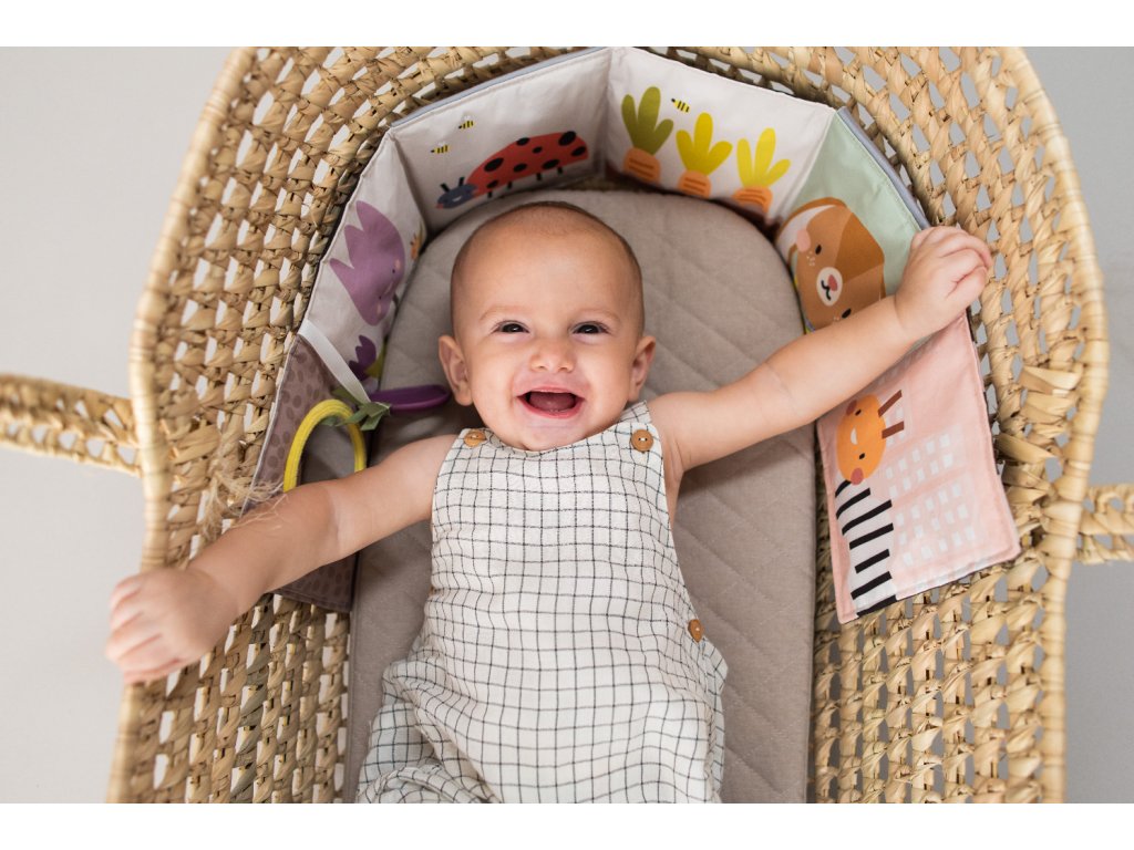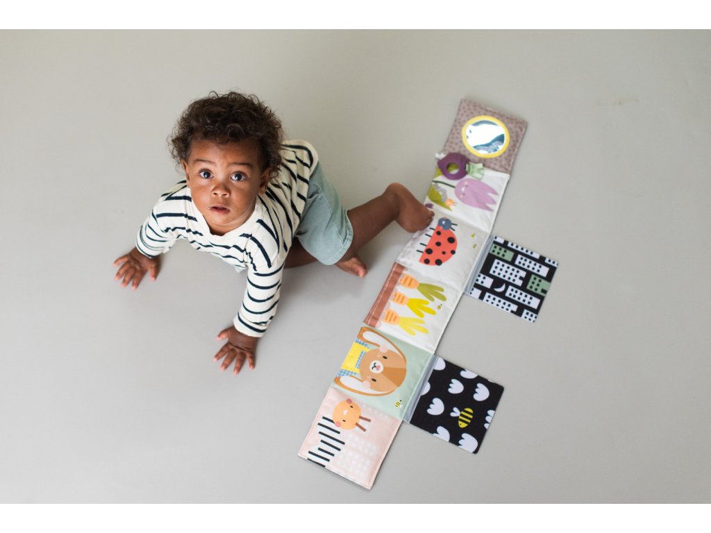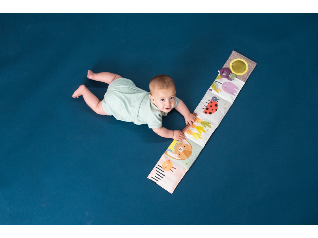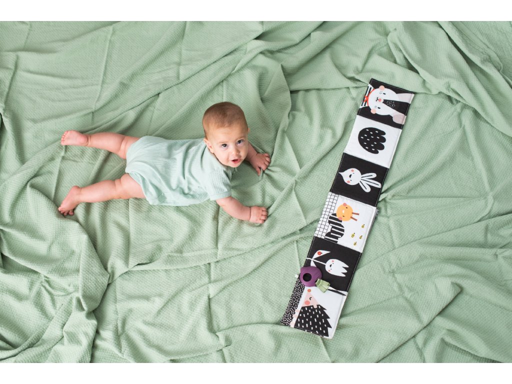 - Od 3 mesiacov: strana farebnými obrázkami, bezpečným zrkadlom, hryzátkom a rôznorodými textúrami na skúmanie, ktoré podporujú rozvoj zmyslov a jemnej motoriky dieťaťa.