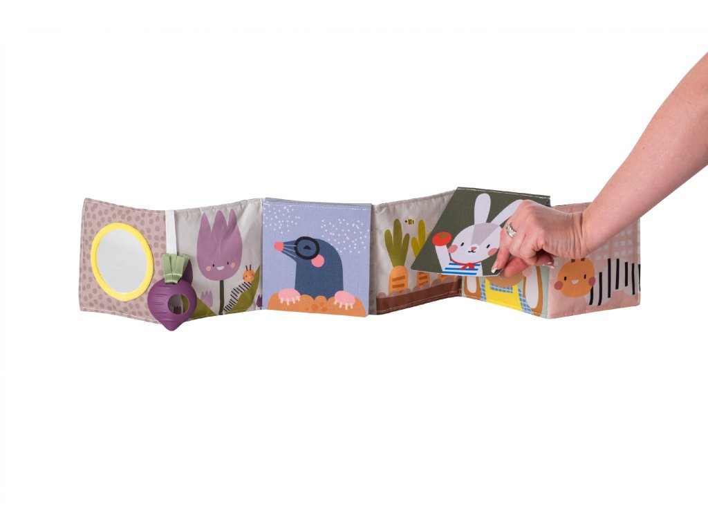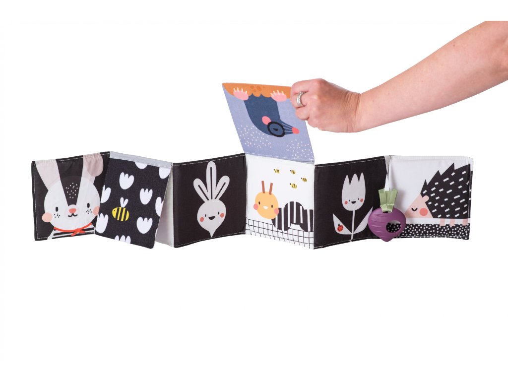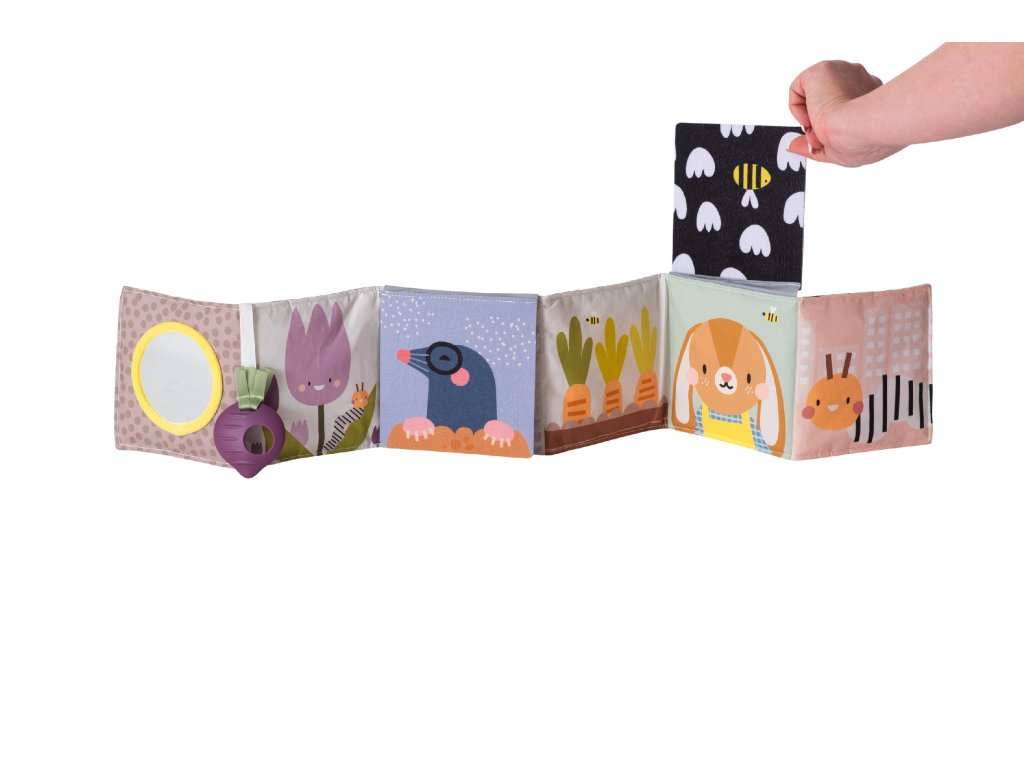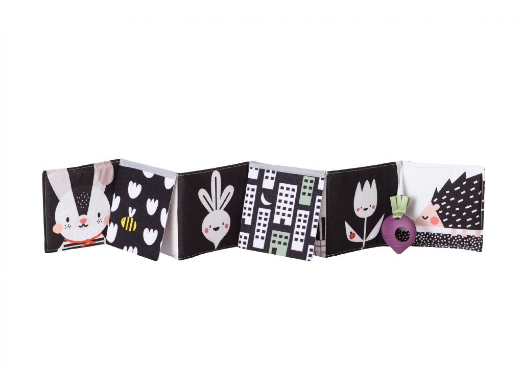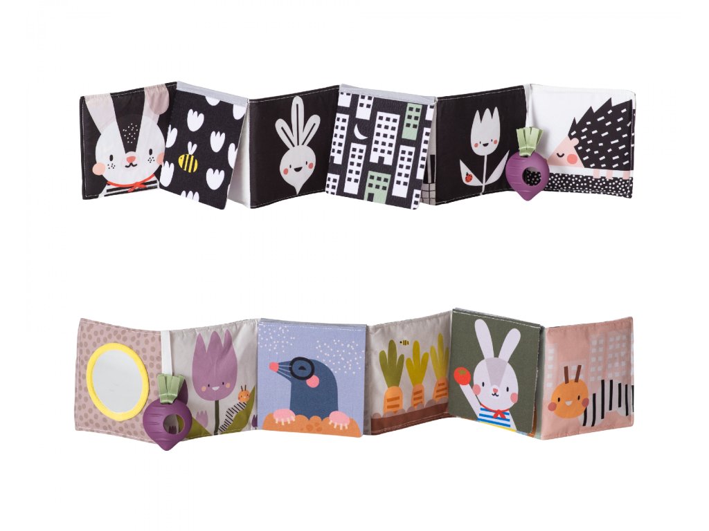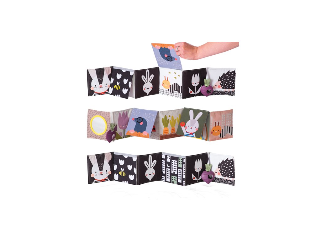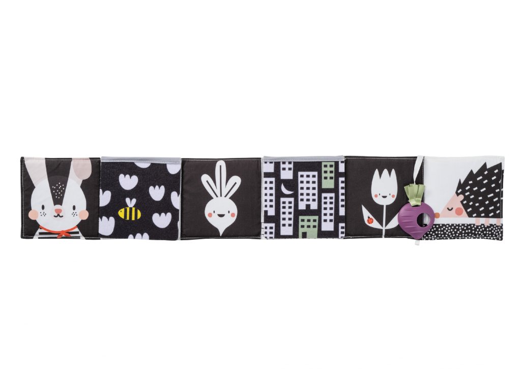 Knižka drží postavená samostatne pre hru na brušku alebo je možné ju pripevniť pomocou plastových klipov na postieľku či do kočíka.