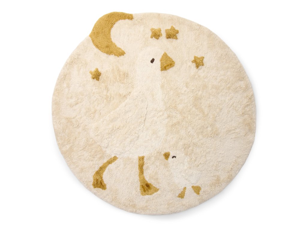 Kúzelný okrúhly koberec s motívom veľkej a malej húsky, mesiaca a hviezdičiek premení každú izbičku na miesto plné pohody a snov. Je hebký, hrejivý a ideálny na hranie, odpočinok alebo čítanie rozprávok.