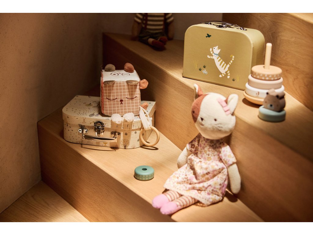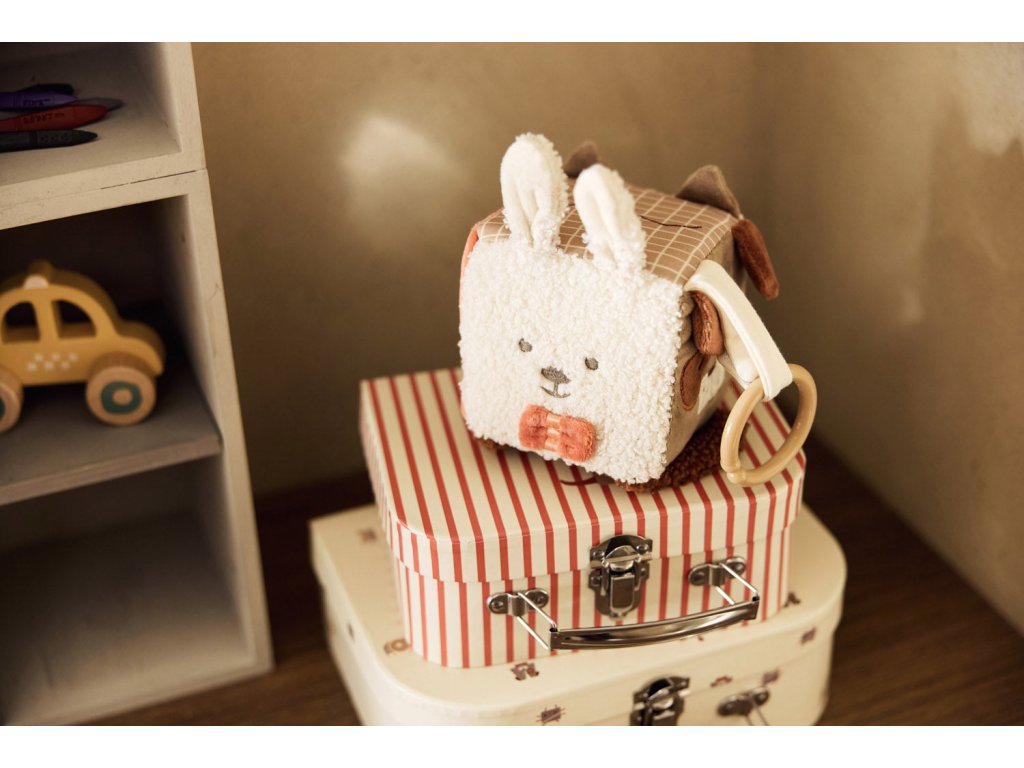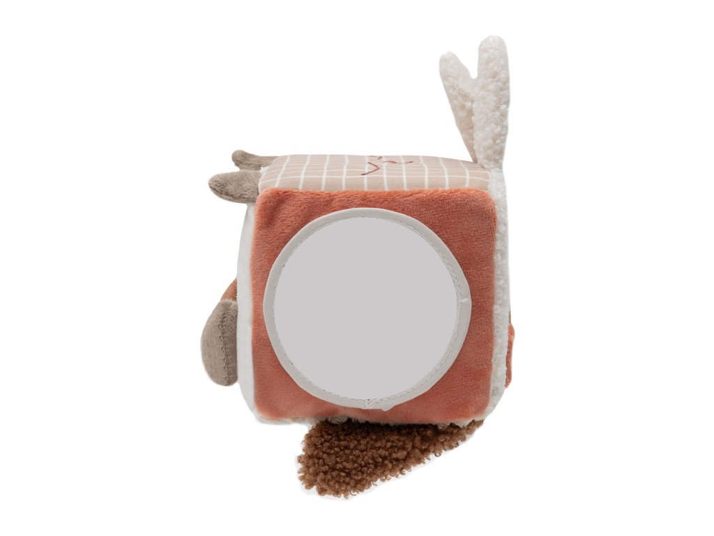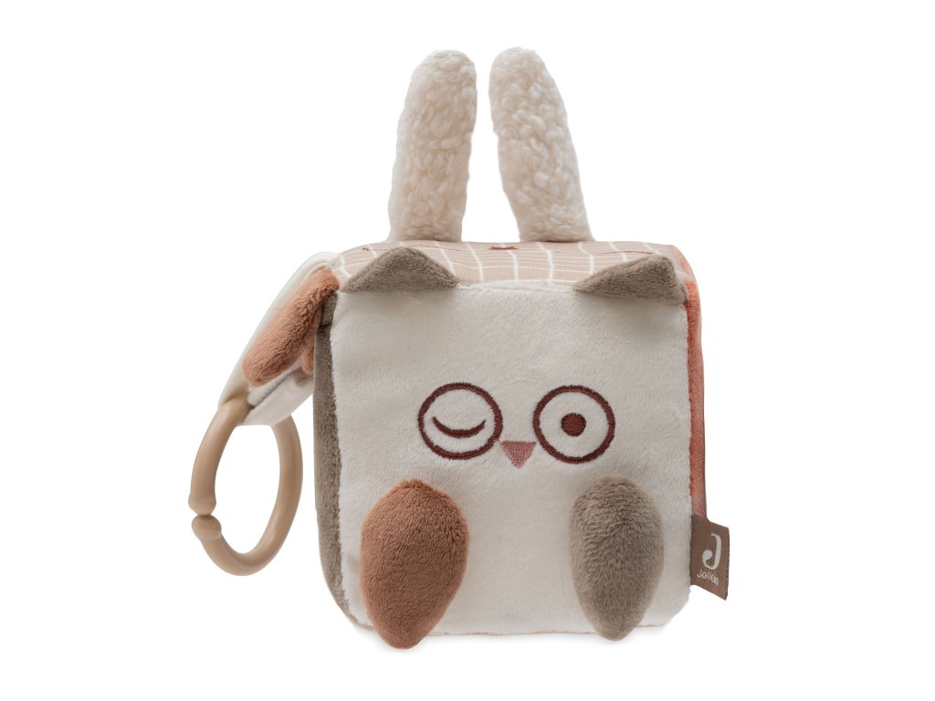 Mäkká plyšová kocka s krásnymi motívmi zvieratiek je vďaka svojmu prevedeniu ľahko uchopiteľná malými detskými ručičkami. Rôznorodé textúry, vyšívané ilustrácie, hrkanie aj šušťanie lákajú dieťa na skúmanie.