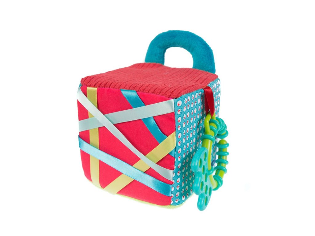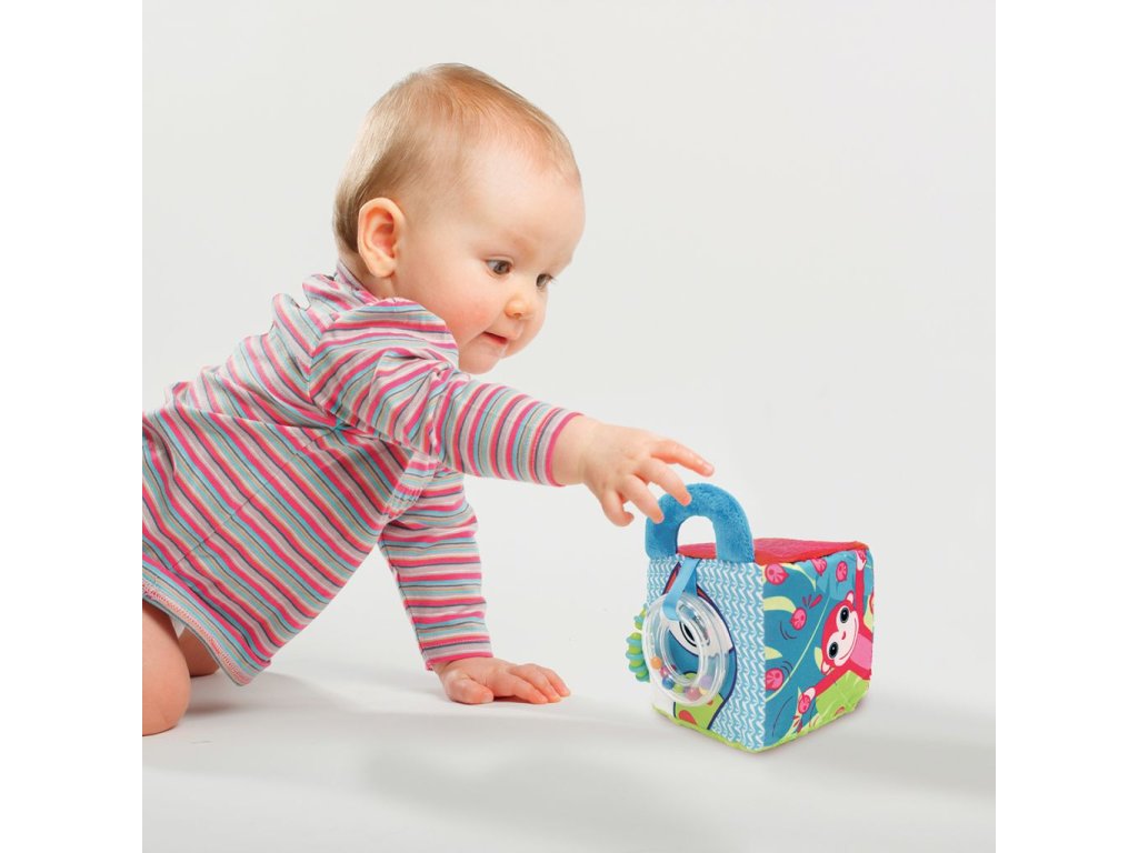 Mäkká textilná kocka ponúka rôznorodé aktivity, ktoré vaše dieťa zabavia a zároveň pomáhajú rozvíjať jeho jednotlivé zmysly aj motorické zručnosti dieťaťa. Pozornosť dieťaťa upútajú výrazné ilustrácie motívov z džungle, priehľadná hrkálka s korálkami, plyšová rukoväť aj hryzátko. Hryzátko v podobe krúžku umožňuje kocku pripevniť na kočík či autosedačku.