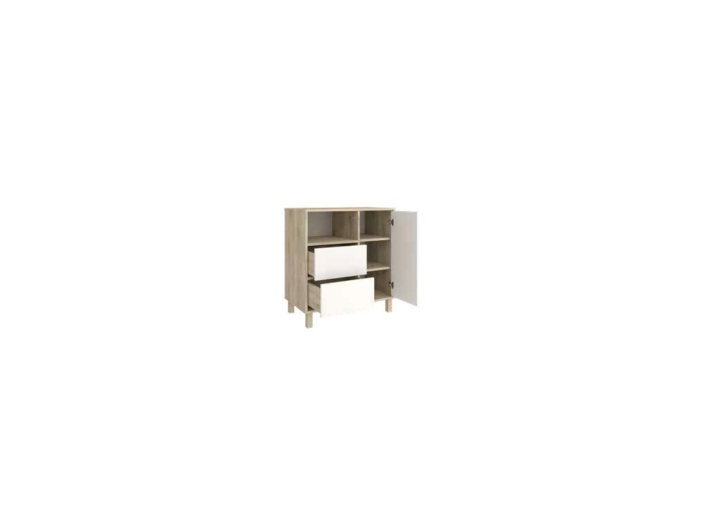 Prevedenie: Dvierka a zásuvky. Na ľavej strane 2 zásuvka a 1 otvorená polička, na pravej strane 1 dvierka, vo vnútri 1 polica.