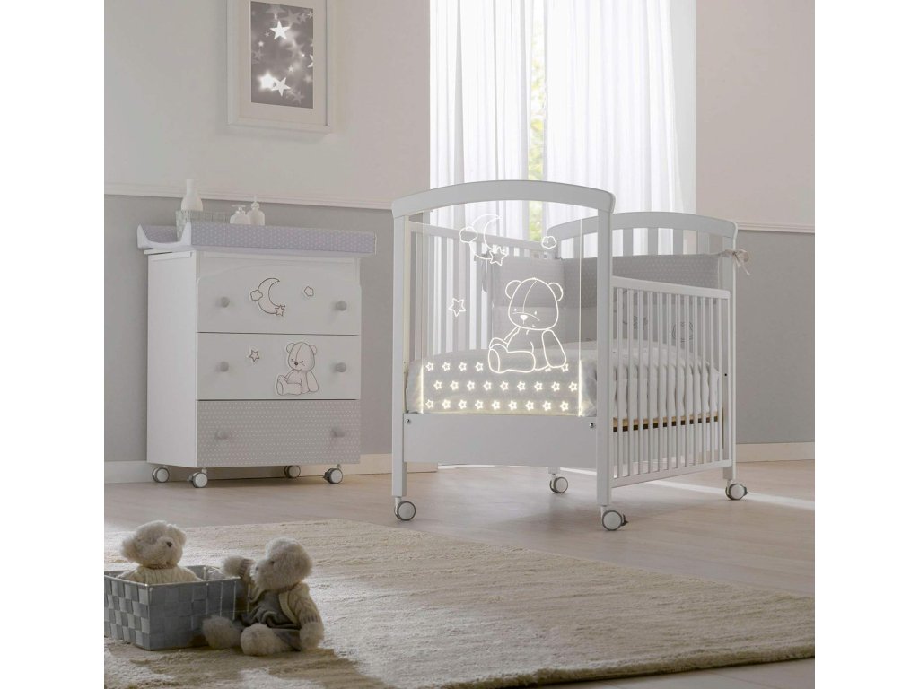 Komoda je vybavená prebaľovacím pultom, ktorý je veľmi praktický kus zariadenia detskej izby pre novorodenca a výrazne uľahčuje manipuláciu s dieťatkom pri prebaľovaní. Pod podložkou sa nachádza vanička.