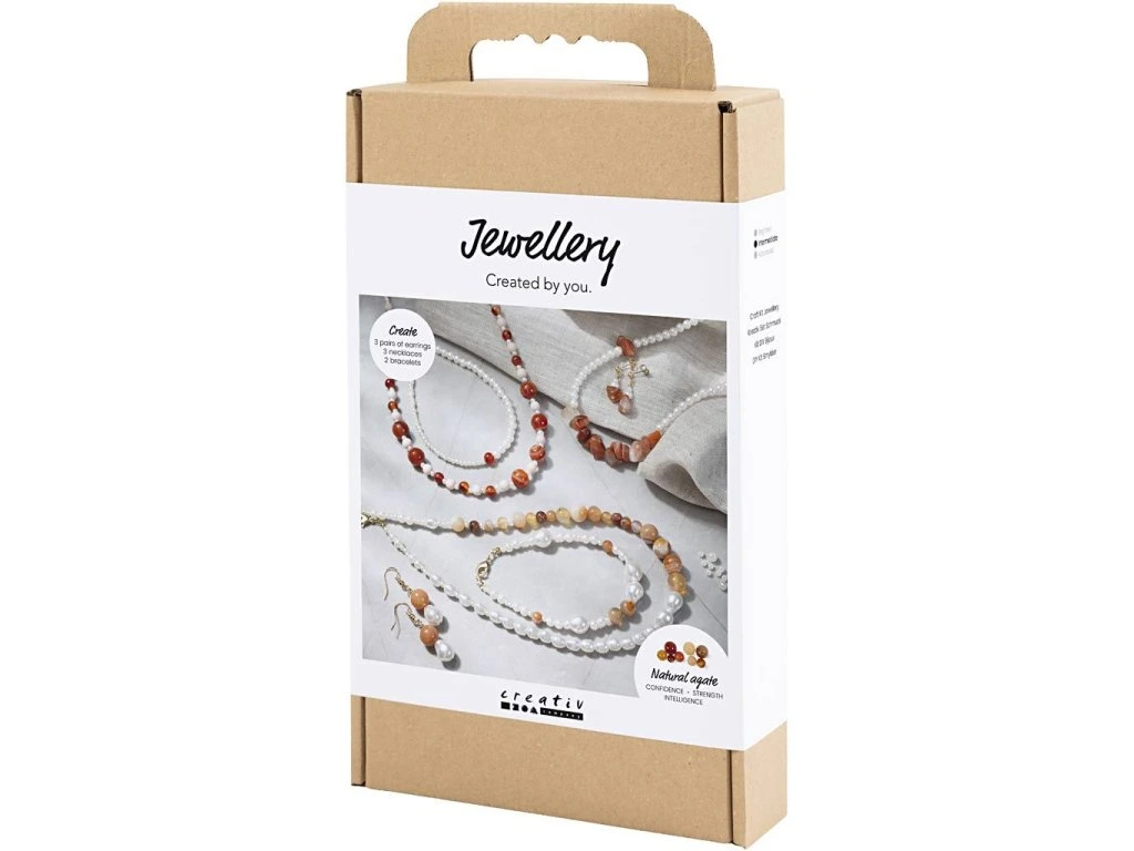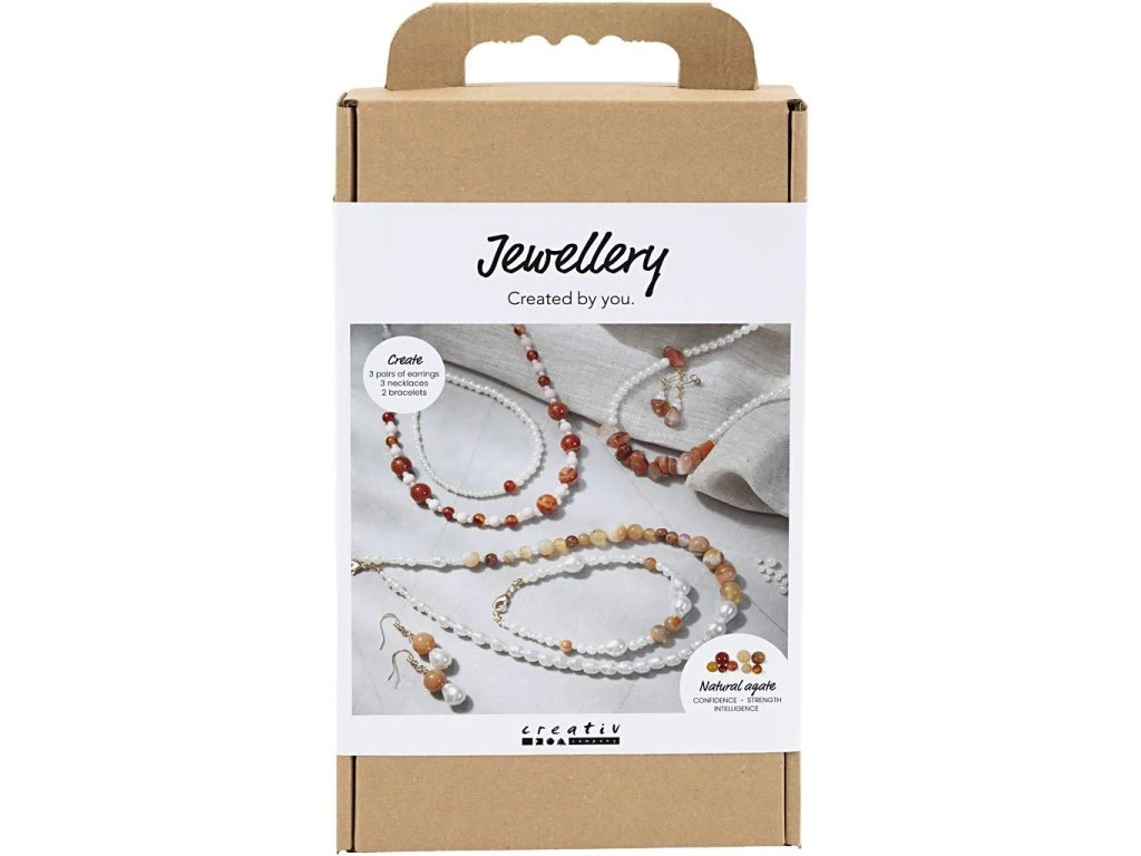 Originálna kreatívna sada na výrobu šperkov z achátu a jantáru. Umožní vám vytvoriť pôsobivé šperky s polodrahokamom achát - s krásnou kresbou, jemnými odtieňmi a výraznou osobitosťou. V balení nájdete materiál na výrobu jedného náhrdelníka, jedného náramku a páru náušníc, vrátane návodu. Achát je obľúbený pre svoj vrstevnatý vzhľad a symboliku vnútornej rovnováhy, av kombinácii s perleťovo bielymi korálkami vzniknú elegantné šperky, ktoré pôsobia luxusne a zároveň prirodzene.