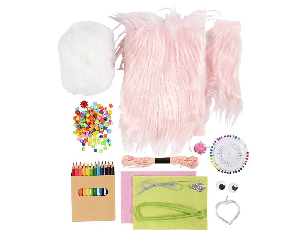 Umelý kožúšok, výplň, pohyblivé očká, niť, ihla, navliekač, špendlíky, plsť, chlpaté drôtiky, brmbolce, plastové korálky, pružná šnúrka, prívesok v tvare srdca a farebné pastelky