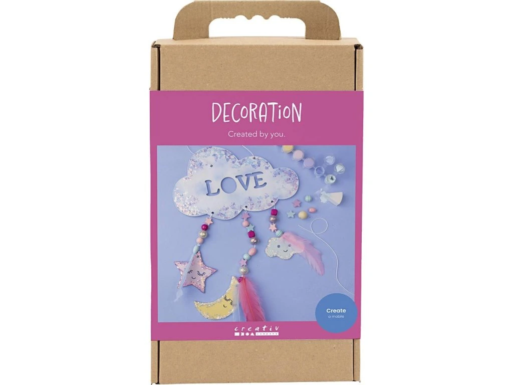 Originálna kreatívna súprava na výrobu závesnej dekorácie s motívom nočnej oblohy. Zábavná sada deťom umožní spoločne s rodičmi vytvoriť originálnu dekoráciu do detskej izby: drevenú dekoráciu si nafarbí, dozdobí trblietavou hmotou a doplní korálky a pierky pre ľahký, snový efekt. Výsledkom je krásna dekorácia, ktorú môžete zavesiť do okna, zo stropu alebo nad posteľ.