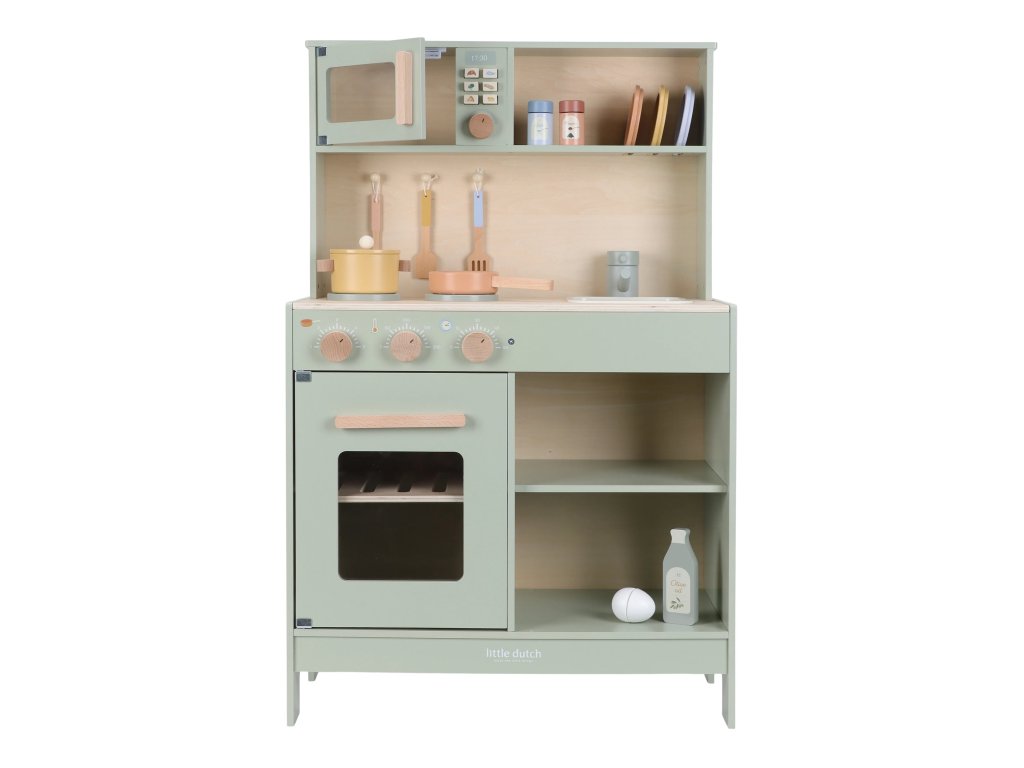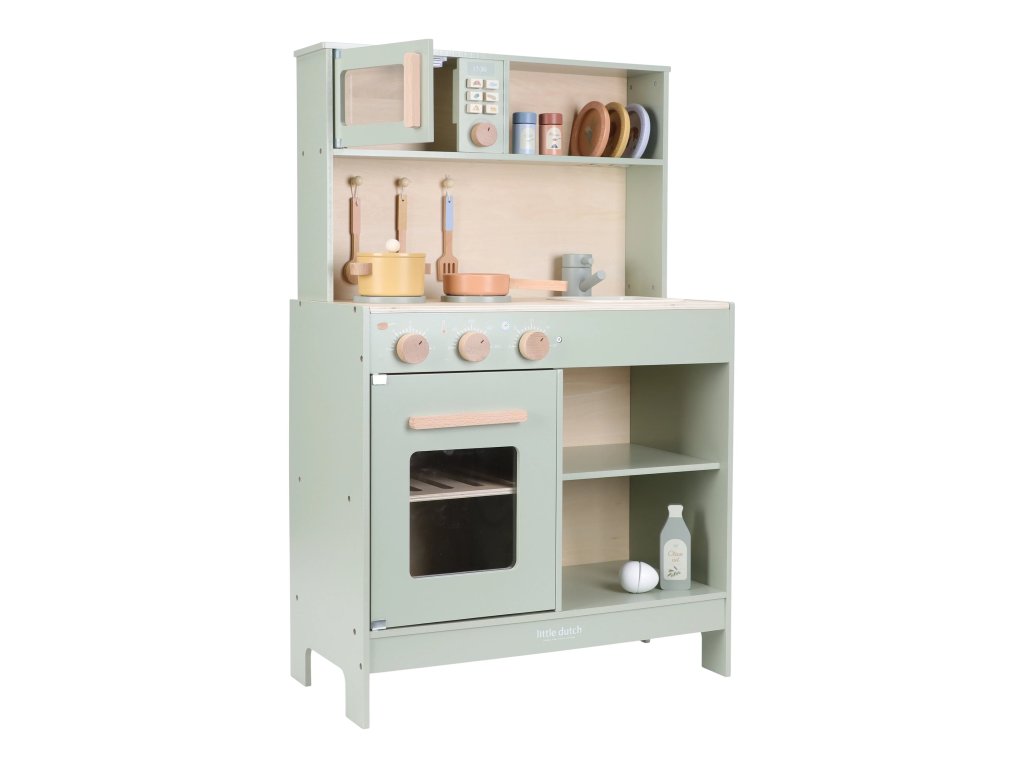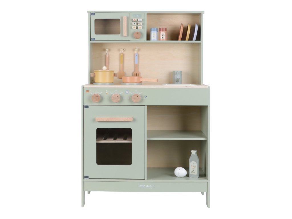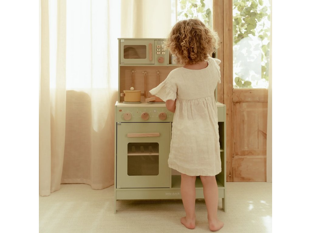 Krásna drevená kuchynka Little Dutch ponúka všetko, o čom malý kuchár či kuchárka sníva, keď vymýšľa nové recepty pre rodinu či svoje bábiky a obľúbené plyšáky. S panvicou, hrncom, tromi tanierikmi a sadou kuchynského náčinia nie je problém pripraviť niekoľko chodov naraz. Rúra upečie koláč, na sporáku sa uvarí zelenina, mikrovlnka rýchlo ohreje, čo je potrebné. K dispozícii je aj olivový olej, vajíčko, soľ a korenie na dochutenie. Po práci si kuchár umyje ruky v dreze. Skrinka ponúka priestor na uloženie potravín.