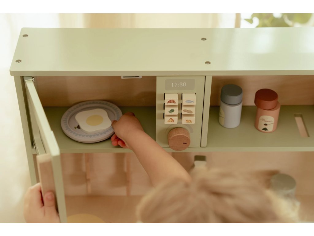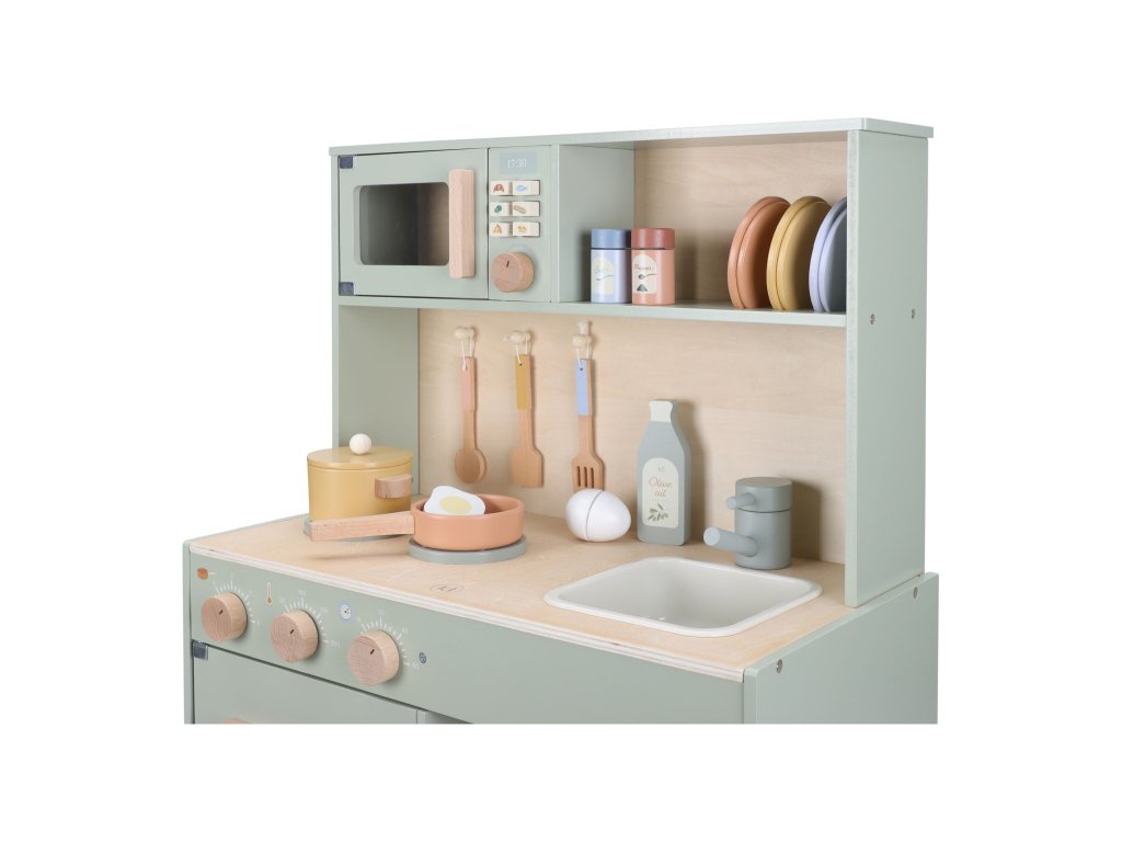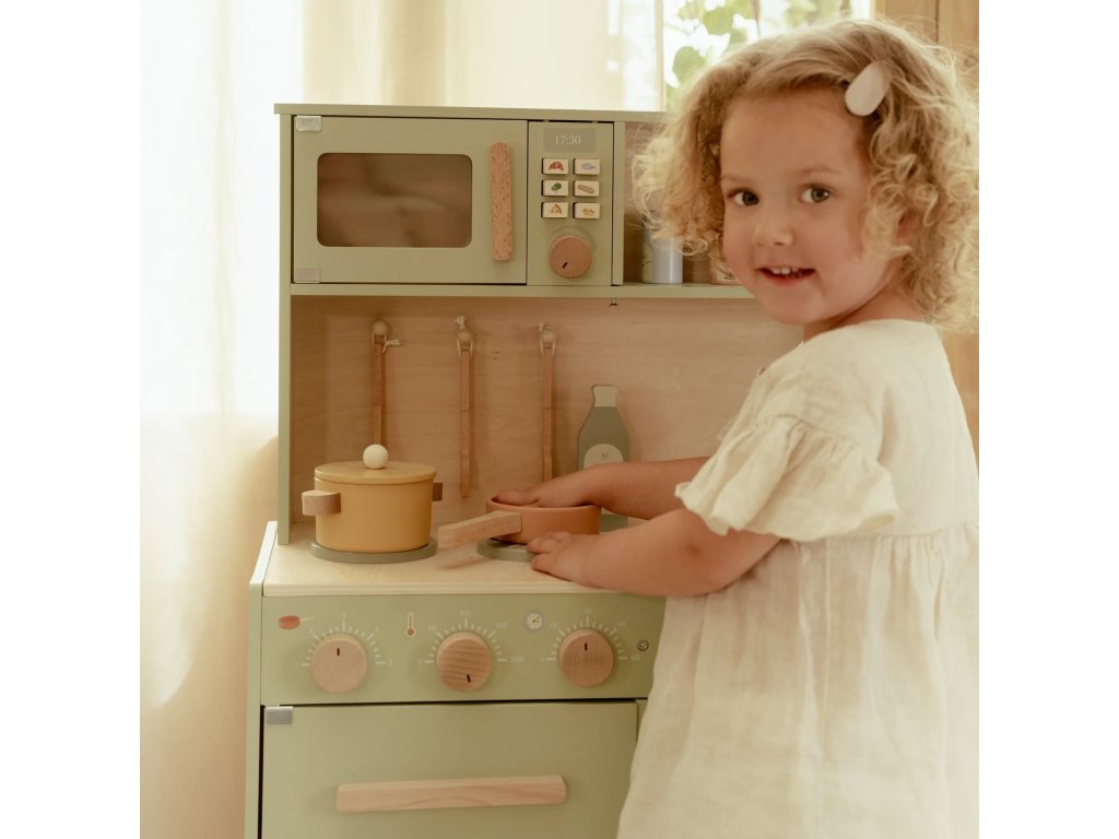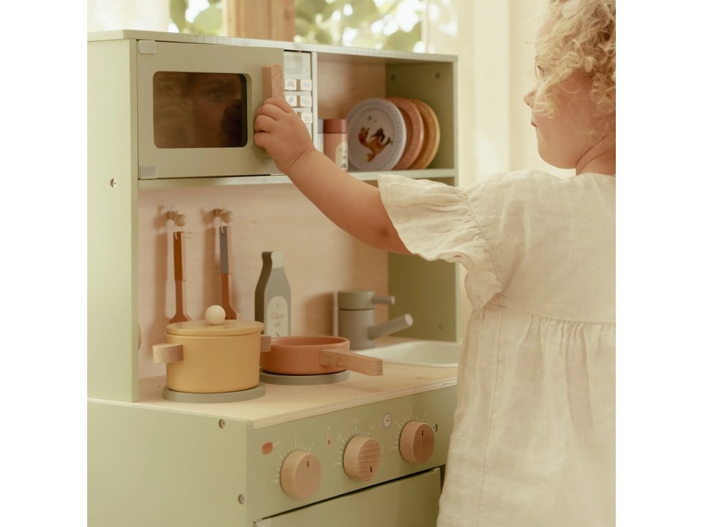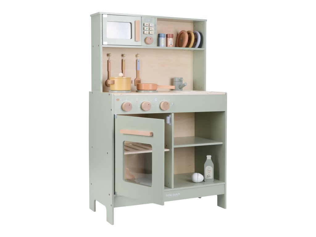 Krásna drevená kuchynka Little Dutch ponúka všetko, o čom malý kuchár či kuchárka sníva, keď vymýšľa nové recepty pre rodinu či svoje bábiky a obľúbené plyšáky. S panvicou, hrncom, tromi tanierikmi a sadou kuchynského náčinia nie je problém pripraviť niekoľko chodov naraz. Rúra upečie koláč, na sporáku sa uvarí zelenina, mikrovlnka rýchlo ohreje, čo je potrebné. K dispozícii je aj olivový olej, vajíčko, soľ a korenie na dochutenie. Po práci si kuchár umyje ruky v dreze. Skrinka ponúka priestor na uloženie potravín.