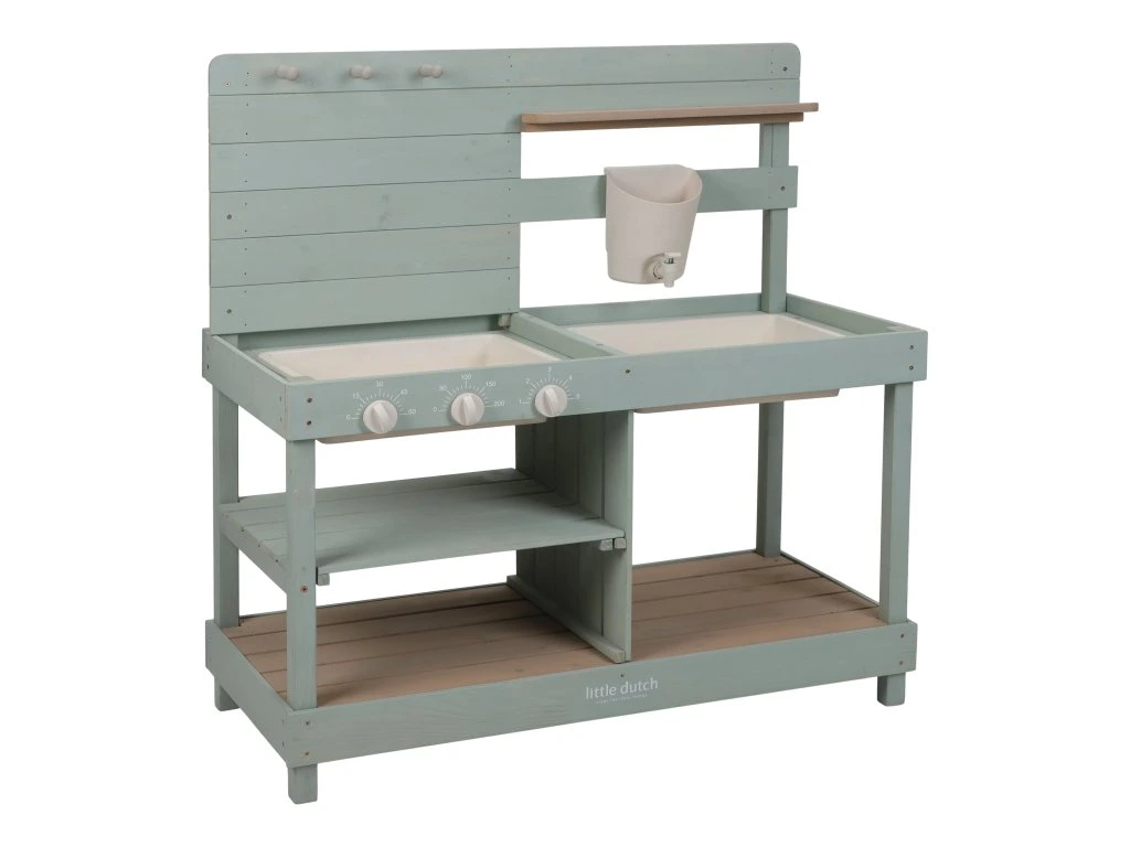Drevená vonkajšia kuchynka je ideálna hračka na záhradu pre malých záhradníkov i malých kuchárov, ktorí milujú tvorenie z piesku, vody a blata. Kuchynka so sporákom má otočné gombíky, dva drezy a dokonca funkčný kohútik s nádržkou na vodu, takže si dieťa môže samo pustiť vodu a doplniť suroviny na „varenie“ vonku. Praktický detail sú tiež dve veľké vaničky schované pod odklopnými doskami, ktoré sú ako stvorené na hranie s vodou.
