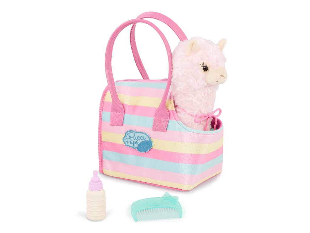 Obsah balenia: taška, plyšová lama, hrebeň, fľaštička