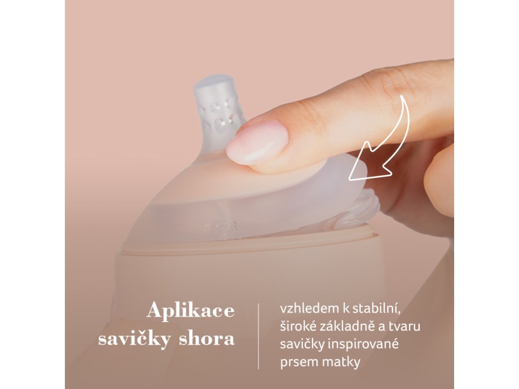 Široký, profilovaný tvar podľa vzoru mamičkiných pŕs a dokonalé proporcie zaisťujú, že ústa dieťaťa sú umiestnené v správnom uhle, pery sú pevne zovreté a dieťa môže voľne dýchať nosom, čo znižuje riziko vzniku koliky.