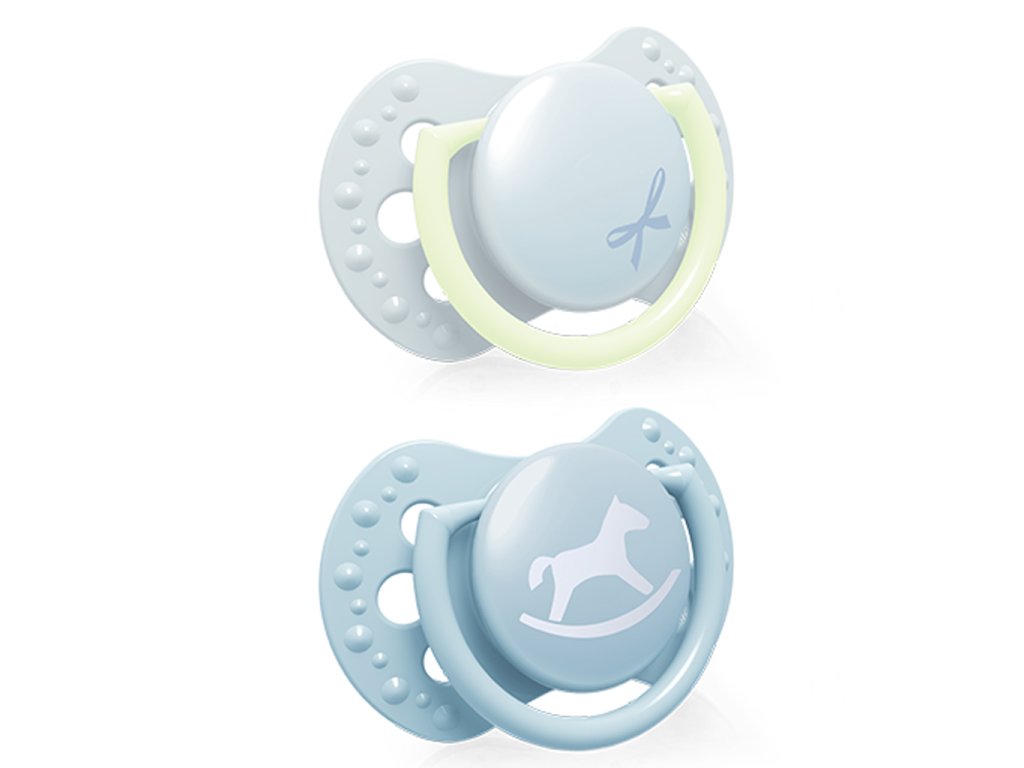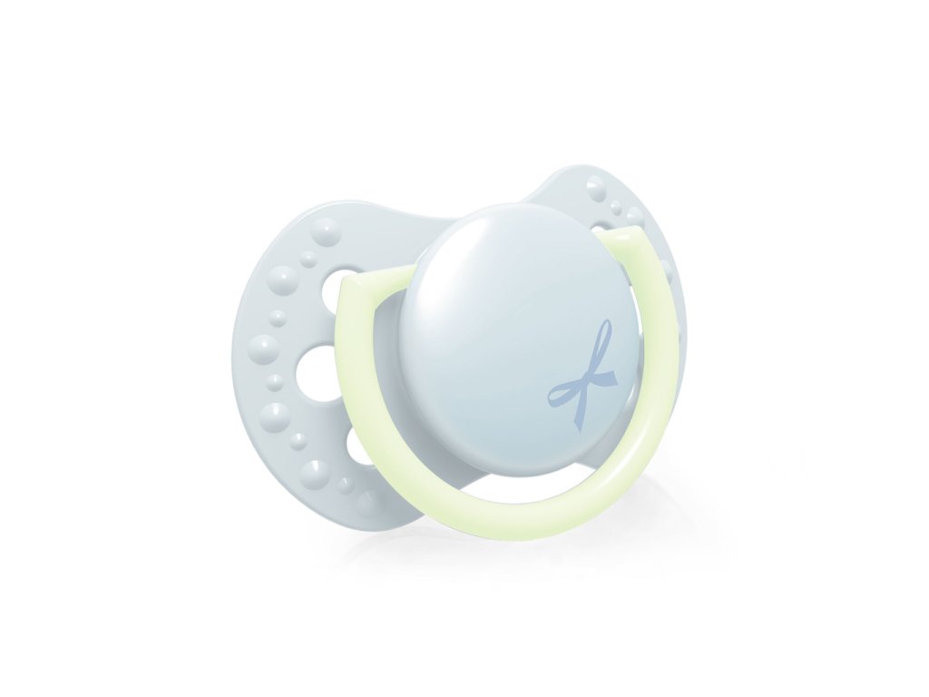 Obsahuje svietiaci krúžok, ktorý ho uľahčuje nájsť v tme. Vďaka zmenšenému štítku je cumlík veľmi ľahký - je vhodnejší pre novorodencov.