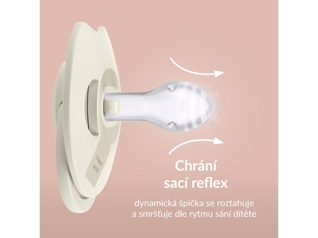 - Dynamický cumlík sa vďaka unikátnej konštrukcii zo silikónu rôznej hrúbky naťahuje a sťahuje podľa rytmu satia dieťaťa. Vďaka tomu chráni jeho sací reflex a nemá nepriaznivý vplyv na dojčenie. Symetrický tvar špičky vychádza z tvaru bradavky naplnenej mliekom, ktorá poskytuje bábätku známy pocit podobný pocitu z prsníka.