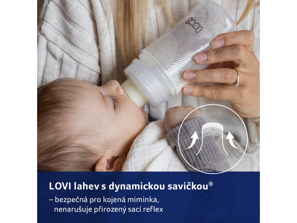 Bezpečné pre dojčené dieťa, nenarúša sací reflex a nenarúša prirodzené kŕmenie. Je vybavená unikátnym dynamickým cumlíkom s tenkým, vyčnievajúcim zakončením, tvrdou, profilovanou základňou a systémom odvodu vzduchu SUPERvent. Fľaša je kompatibilná so všetkými odsávačkami LOVI. LOVI Trends fľaša je potlačená jemným dizajnom v súlade s najnovšími trendmi.