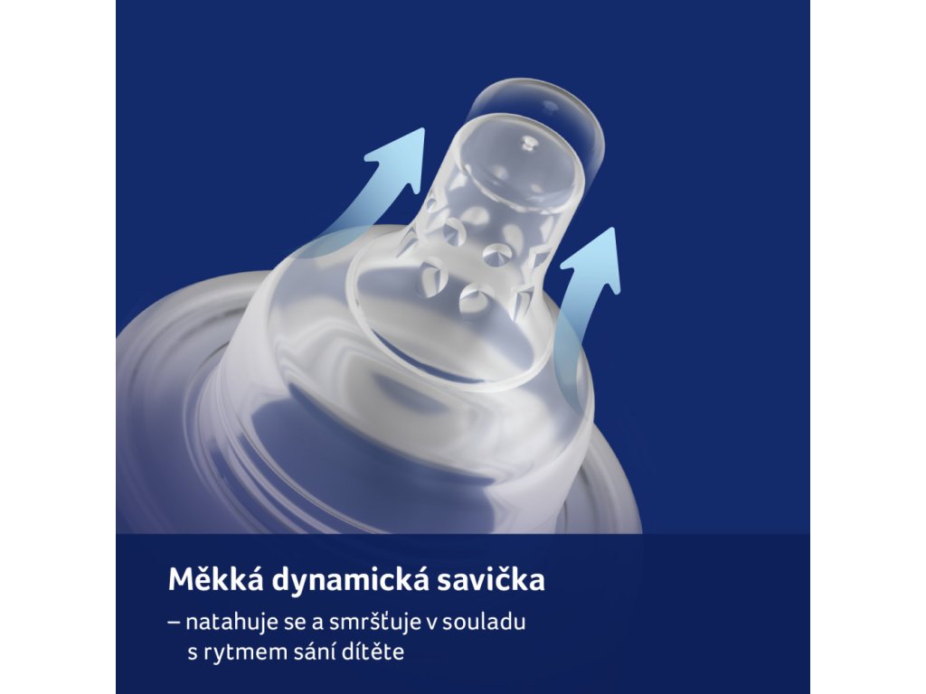 Dynamický cumlík - Špička je vyrobená z tenkej vrstvy silikónu a dynamicky sa prispôsobuje saniu bábätka (predlžuje sa). Povzbudzuje svaly čeľustí k aktívnej činnosti. Mlieko nevyteká, dieťa ho musí aktívne sať.