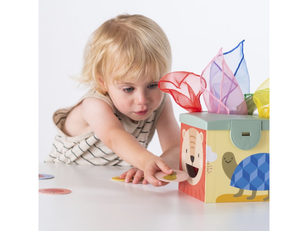 Magic Box obsahuje všetko, s čím sa malé deti rady hrajú! V kúzelnej krabici nájdu loptičky, šatky a obojstranné okrúhle kartičky s obrázkami. Šatky je zábavné z krabice vyťahovať, kartičkami zase kŕmiť večne hladného medvedíka na boku krabice. Loptičky sa po vhodení do otvoru na krabici vykotúľa otvorom z boku.