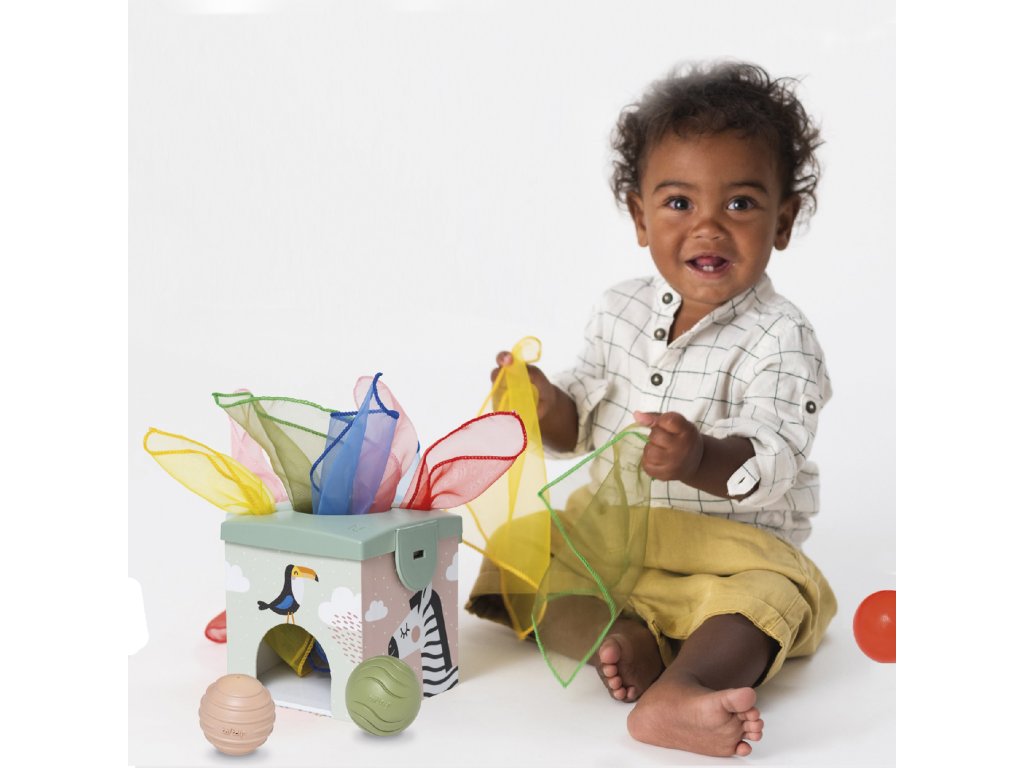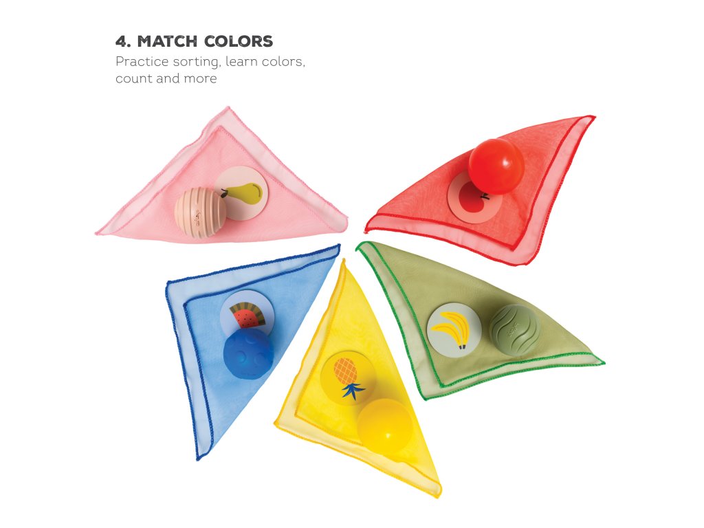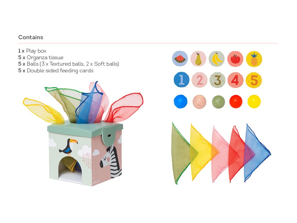 Šatky z jemnej organzy a loptičky s rôznorodými textúrami pomáhajú rozvíjať dieťaťu úchop a jemnú motoriku. Pri kŕmení usmievavého medvedíkmi kartičkami s obrázkami ovocia sa rozvíja emočná inteligencia a predstavivosť dieťaťa.