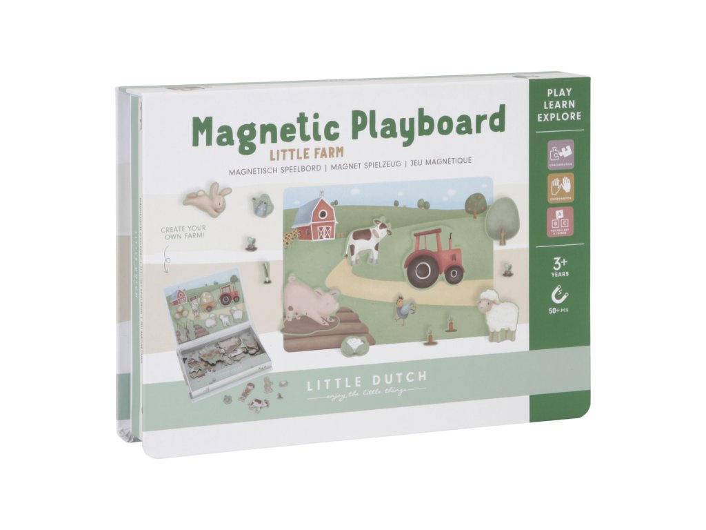 Magnetická hra sa skladá z magnetických dielov s motívmi zo života na farme a 6 vzorových kariet. Magnetické veko je možné použiť ako hernú dosku.