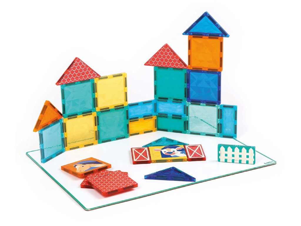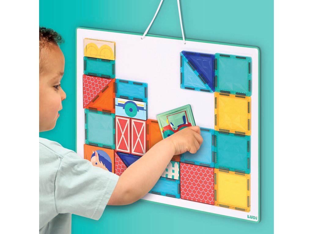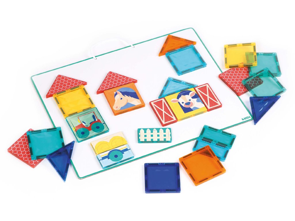 Rozviňte detskú kreativitu, predstavivosť a logické myslenie s touto originálnou magnetickou stavebnicou Ludi s tabuľou a motívmi zo života na farme. Farebná sada s 27 priehľadnými aj ilustrovanými dielikmi ponúka zábavné stavanie v 2D aj 3D. Deti môžu vytvárať scény zo života na farme – postaviť si stajne, polia, výbehy pre zvieratká alebo sa hrať s traktorom a domácimi zvieratami. Priehľadné farebné dieliky vytvárajú pri dopade svetla nádherné tiene a svetelné efekty – ako v kaleidoskope. Nechýbajú ani ilustrované dieliky s motívmi koníka, kravy, ohrady alebo traktora.