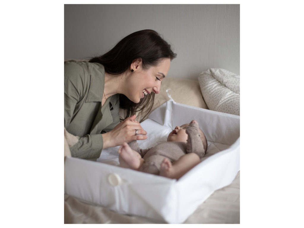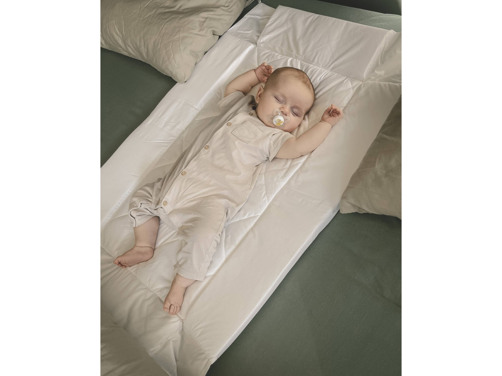 Matrace pro společné spaní s rodiči vytváří miminku vlastní bezpečný prostor přímo v posteli rodičů. Je ideální pro noční kojení i krmení z lahve, protože umožňuje přiblížit dítě k sobě bez nutnosti ho zvedat. Stačí sklopit jednu bočnici, pohodlně si lehnout vedle miminka a po dokrmení bočnici zase zvednout, aby dítě leželo stabilně a bezpečně. Spodní část je vodoodpudivá, aby chránila lůžko před úniky při krmení, ublinknutí nebo protečení pleny.