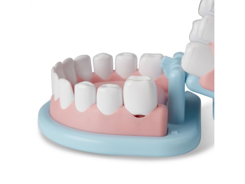 S hernou súpravou Melissa & Doug Super úsmev – Zubárska súprava sa deti môžu premeniť na malého zubára alebo zubárku a zábavnou formou sa naučiť, ako sa správne starať o svoje zuby. Táto rozsiahla súprava obsahuje 26 dielov, ktoré umožňujú realistickú hru na zubnú ordináciu vrátane nadrozmernej súpravy zubov a detailne spracovaných zubárskych nástrojov. Táto súprava ponúka deťom pestrú a vzdelávaciu zábavu, či už ide pri čistení zubov, nasadzovaní strojčeka alebo ošetrovaní zubného kazu. Medzi bohatým príslušenstvom nájdete aj škrabku, zrkadlo, zubnú niť, ústnu sprchu a pohár. Súčasťou sú aj dva tampóny z gázy, tri poháre na zubné kefky, podnos na nástroje, rúško, opakovane použiteľný identifikačný preukaz a obojstranný záznamový hárok pacienta. Vďaka širokej škále doplnkov si môžu deti od 3 rokov zahrať rôzne situácie, čo rozvíja ich predstavivosť, sociálnu interakciu aj jazykové schopnosti. Už viac ako 35 rokov prináša značka Melissa & Doug vzdelávacie hračky v oblasti hrania rolí, puzzle, dosiek s aktivitami, drevených stavebníc, kreatívnych súprav a mnohých ďalších. Všetky podporujú rozvoj detí v rôznych oblastiach a ponúkajú veľa zábavy. Hra sa začína s hračkami Melissa & Doug.