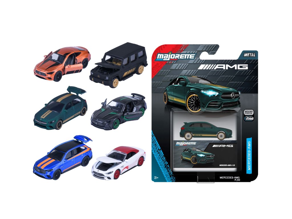 Kovové autíčko na voľnobeh Mercedes-AMG Deluxe v mierke 1:64, zberateľský box. Otváracie časti, 6 druhov. Dĺžka 7,5 cm.