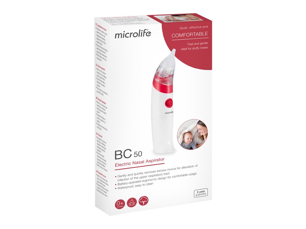 Elektrická nosová odsávačka Microlife BC 50 poskytuje jemné a nepretržité odsávanie na jednoduché a efektívne odstránenie nosového hlienu u detí vo veku od 0 mesiacov. Jemne a rýchlo odstraňuje prebytočný hlien na zmiernenie infekcie horných dýchacích ciest. Microlife BC 50 vyčistí nos dieťaťa jednoducho, hygienicky a efektívne v priebehu niekoľkých sekúnd.