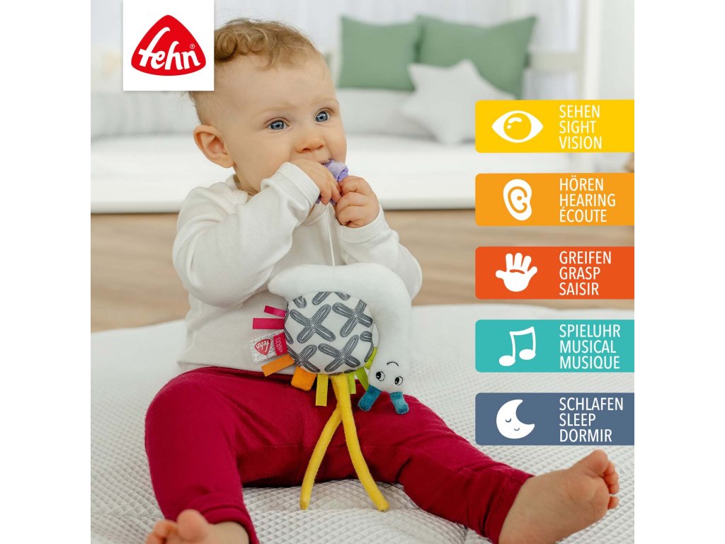 Vďaka praktickej veľkosti a upevňovacím pásikom možno mini hrací strojček ľahko pripevniť na postieľku, autosedačku alebo kočík. Hrací mechanizmus je vyberateľný.