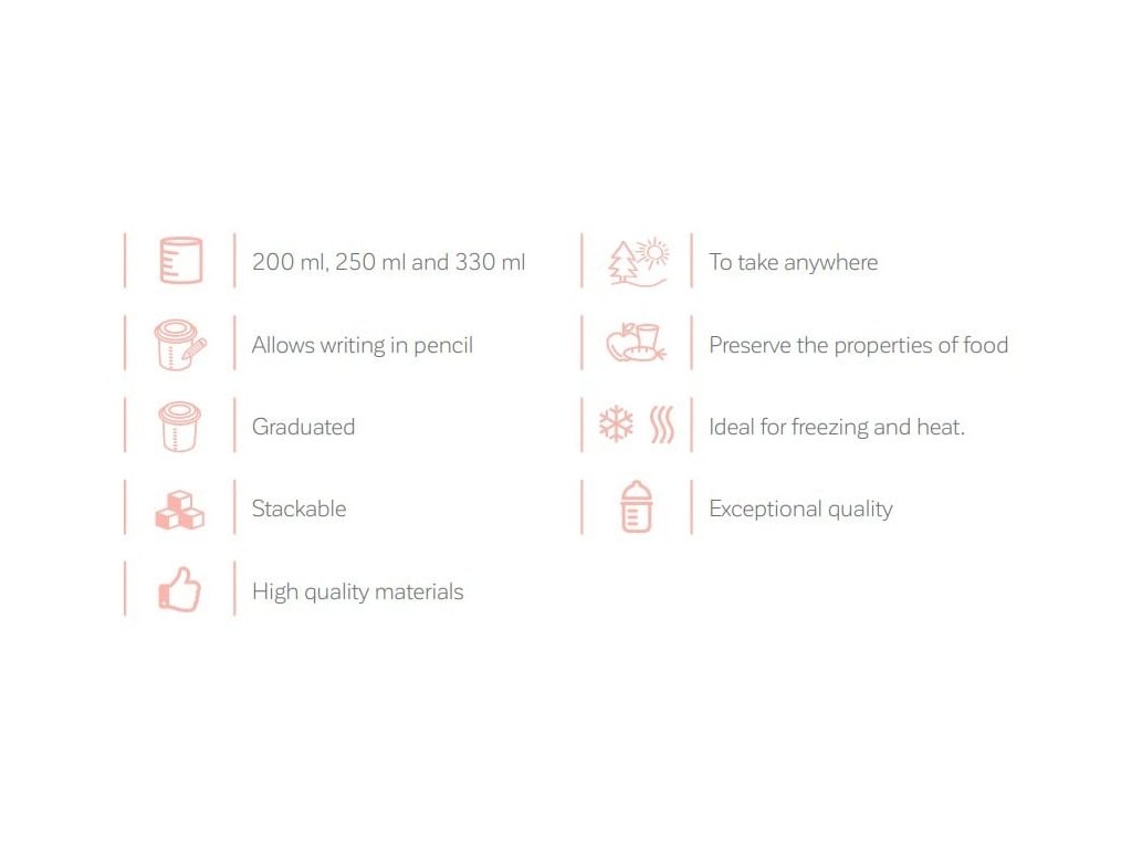 Súprava je ideálna na uskladnenie rôznych typov potravín, od materského mlieka a prvých detských kaší až po výživné polievky a šťavy. Vďaka hermetickému uzáveru sú vhodné aj na prenášanie pevnej stravy, ako sú desiate a dezerty. Objemy nádob sú prispôsobené potrebám dieťaťa.