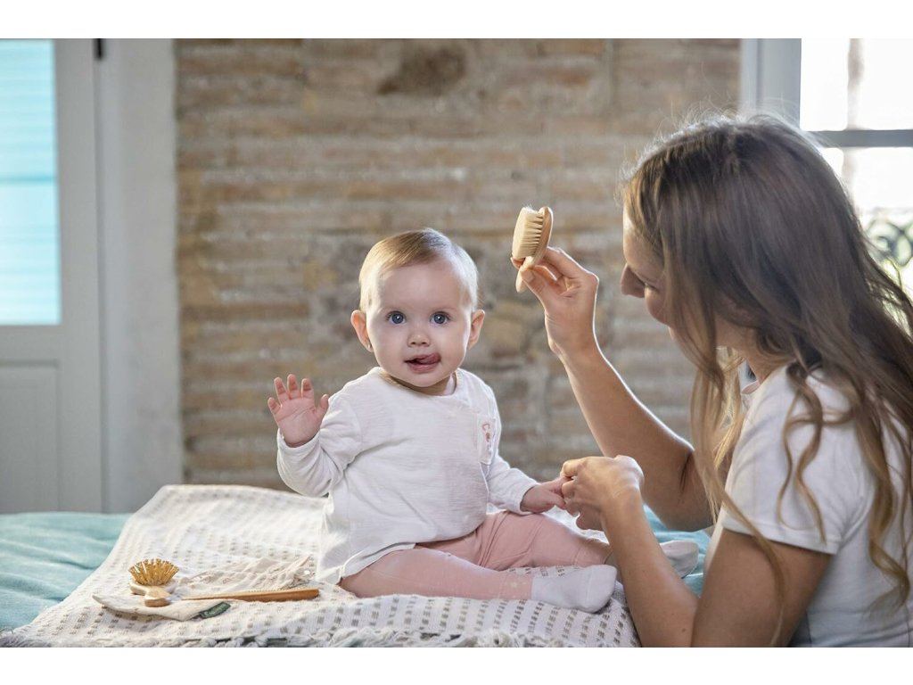 Jemná kefka pre novorodencov: Je navrhnutá s mimoriadne jemnými prírodnými štetinami. Táto kefka nielenže šetrne rozčesáva jemné vlásky, ale zároveň jemne masíruje citlivú pokožku hlavy bábätka, čo vytvára príjemný a upokojujúci pocit.