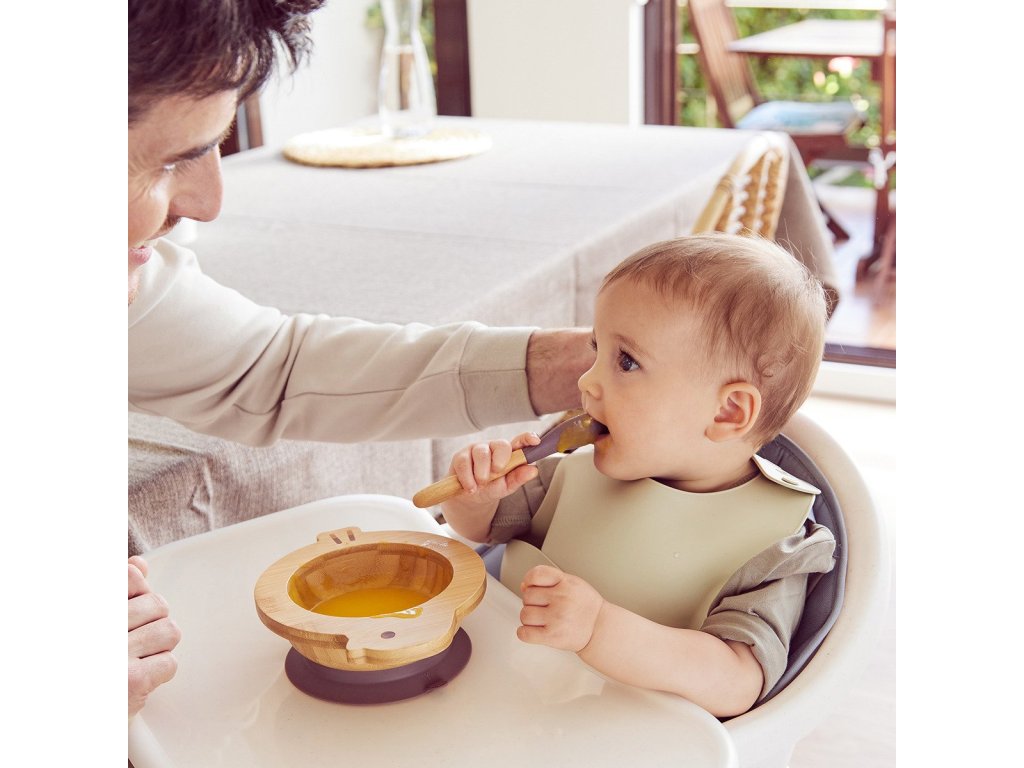 Ergonomická Lyžička: Lyžička s drevenou rukoväťou a mäkkým silikónovým koncom je ergonomicky prispôsobená malým rúčkam. Zaručuje bezpečné kŕmenie bez rizika podráždenia citlivých ďasien a prvých zúbkov dieťaťa.