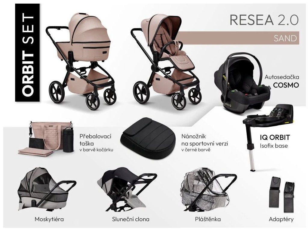 Výhodná sada Resea 2.0 obsahuje nánožník black na športovú verziu, prebaľovaciu tašku vo farbe kočíka, moskytiéru, slnečnú clonu, pláštenku a adaptéry na autosedačku, autosedačku Avionaut Cosmo 2.0+ otočnú základňu Orbit.