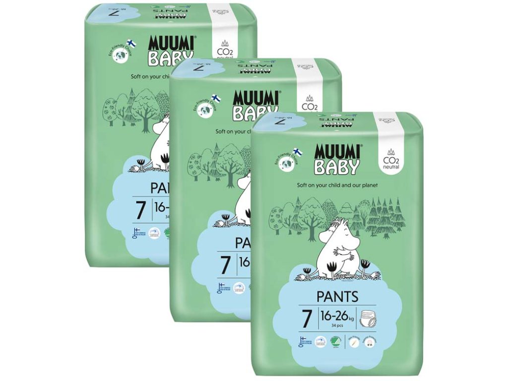 MUUMI Baby Pants 7 XL 16-26 kg (102 ks), mesačné balenie nohavičkových eko plienok
