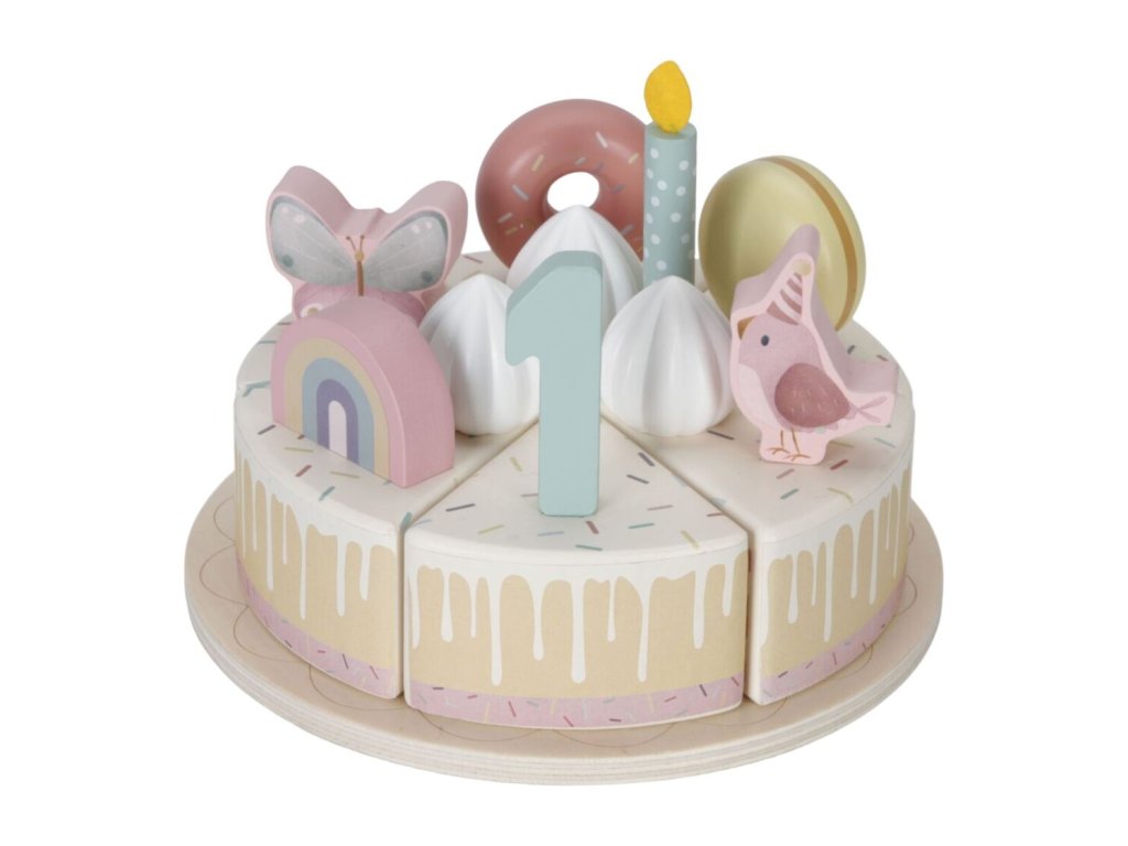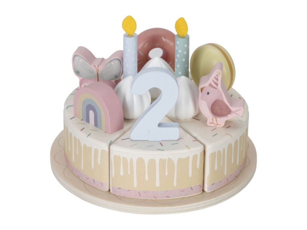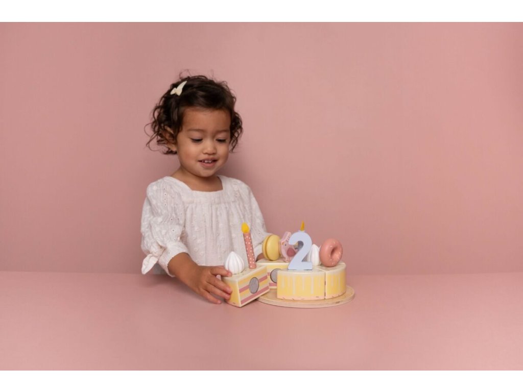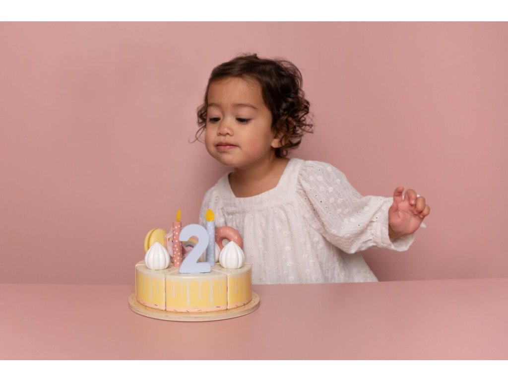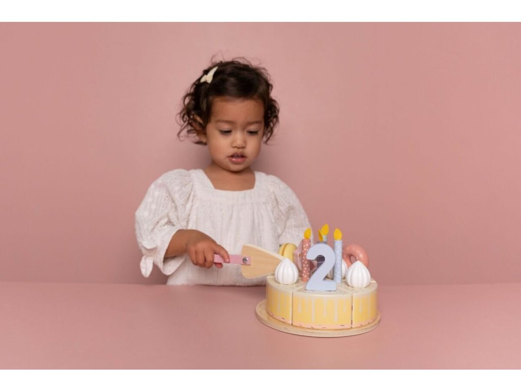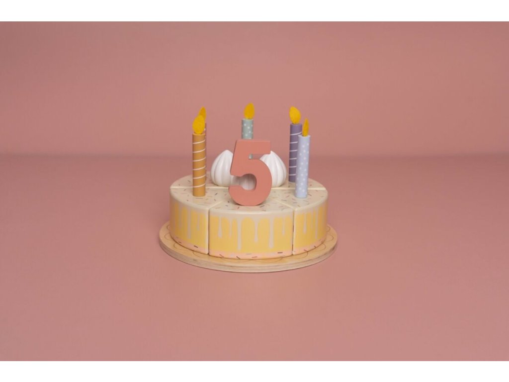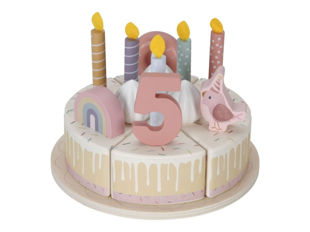 Sada s tortou v krásnom drevenom prevedení obsahuje 6 kúskov torty, 8 odnímateľných zdobení, 5 číslic, 5 sviečok, tanier na tortu a servírovaciu lopatku.