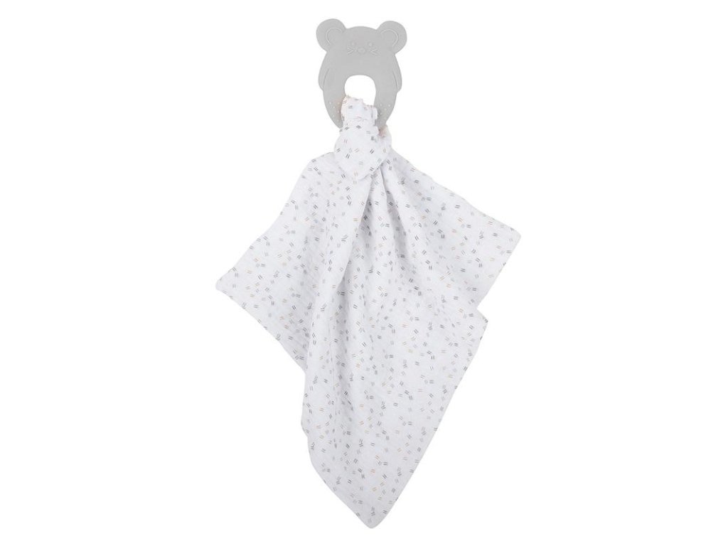 Dečka je z extra mäkkej látky zo 100% bavlny, ktorá má otvor na jednoduché pripevnenie a vybratie hryzačky. Hryzačka má textúrovaný povrch na masáž a upokojenie ďasien počas hryzenia..