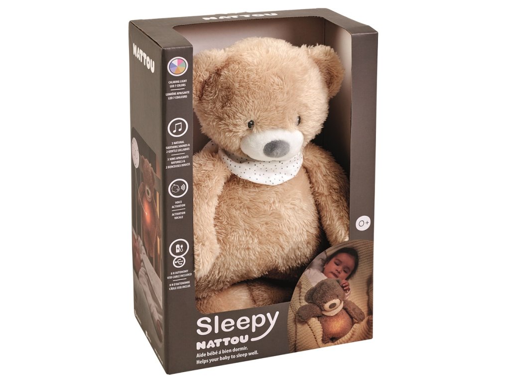Medvedík na spanie Nattou je krásnej mäkkej kvality s príjemnou výplňou. Spiaci medvedík má v brušku svetielko, ktoré sa môže meniť medzi siedmimi farbami a zvukom, s bielym šumom, morom, tlkotom srdca a dvoma upokojujúcimi uspávankami, ktoré pomáhajú zabezpečiť pokojný spánok. Zvuky spiaceho medvedíka sa aktivujú automaticky, keď započuje plač dieťaťa a zvuky automaticky prestanú po 15 minútach. Svetlo spiaceho medvedíka vychádza z LED diódy v brušku, takže svetlo je tlmené textíliou zajačika a neprehrieva sa, teda svetlo môže bez problémov svietiť celú noc.