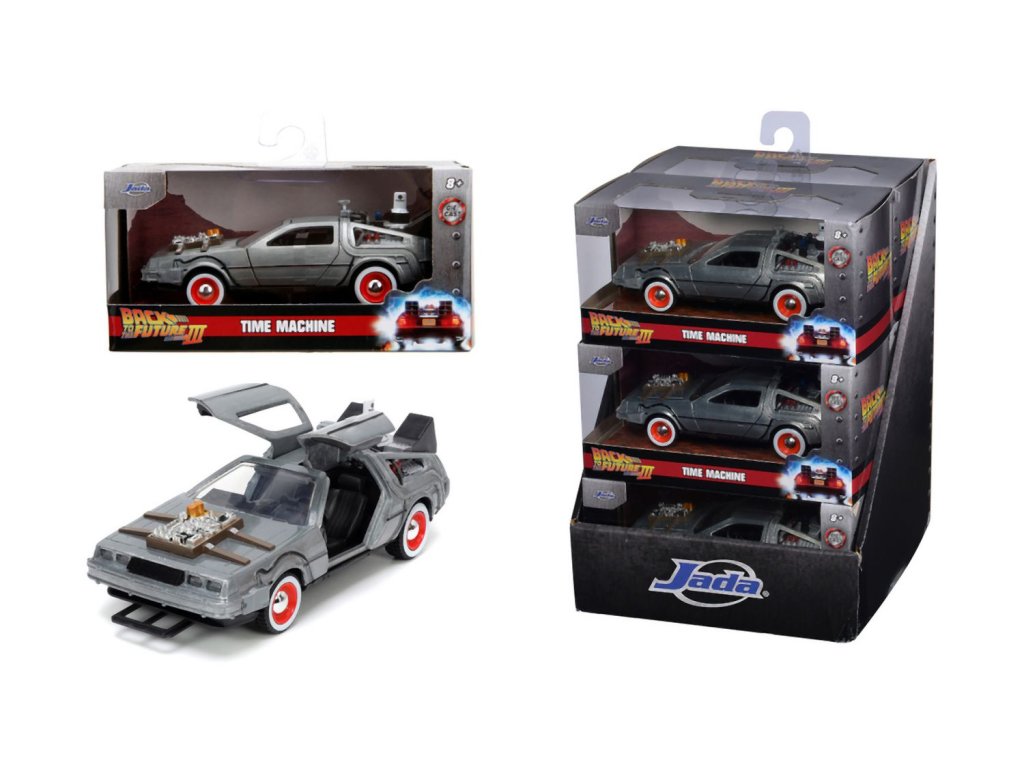Kovový model Time Machine Back to the Future 3 na voľnobeh v mierke 1:32 s otváracími dverami. Displej obsahuje 6 ks.