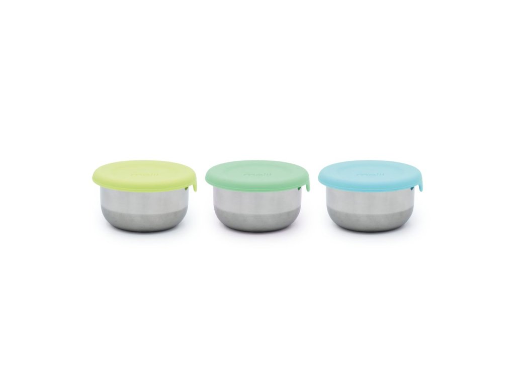 Sada obsahuje 3 nerezové mištičky s objemom 89 ml s farebnými silikónovými viečkami , ktoré perfektne tesnia a pomáhajú udržať jedlo dlhšie čerstvé. Vďaka tesniacemu viečku sú vhodné na prenášanie potravín bez rizika úniku. Dózičky sú odolné, ľahké a nepriepustné . Diely kompaktnej veľkosti a designu sa ľahko zmestia do každej desiatovej krabičky či bento boxu.
